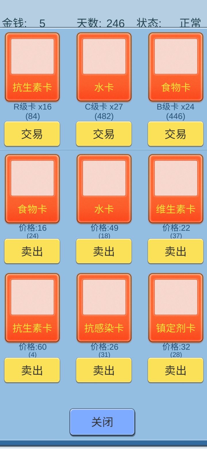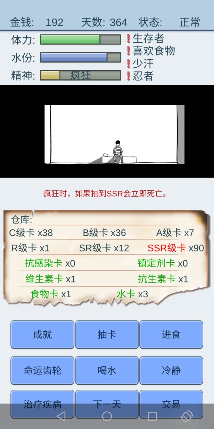 通关,精神强大,贪婪,好运气,生存者交易里遇到食物卡水卡高价,b卡换水卡,r卡换镇定剂直接进入闭环,一直倒卖,59天100ssr通关