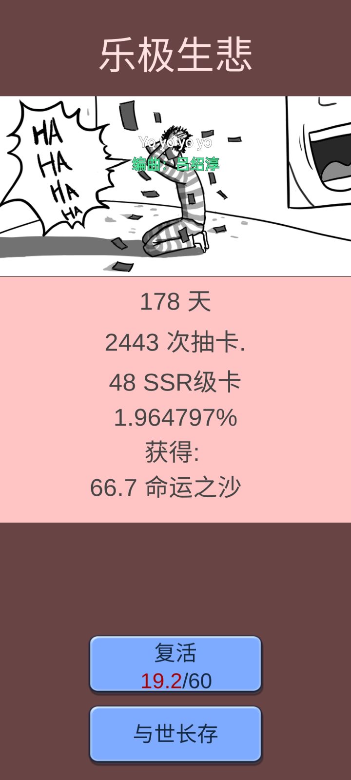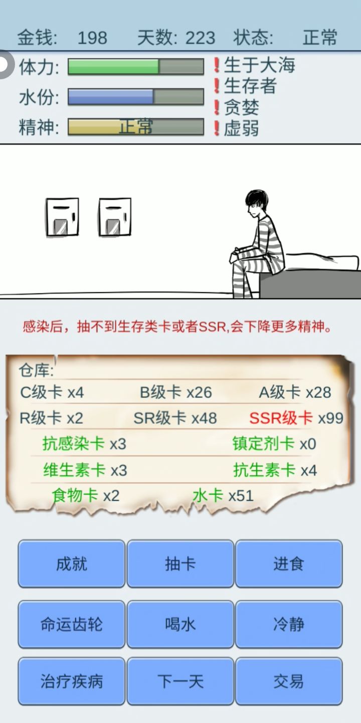 完了第一把就通关了,感觉还挺简单的,背景设定也很有意思,食物和水都需要抽卡抽到才行,不然前期就活不下去