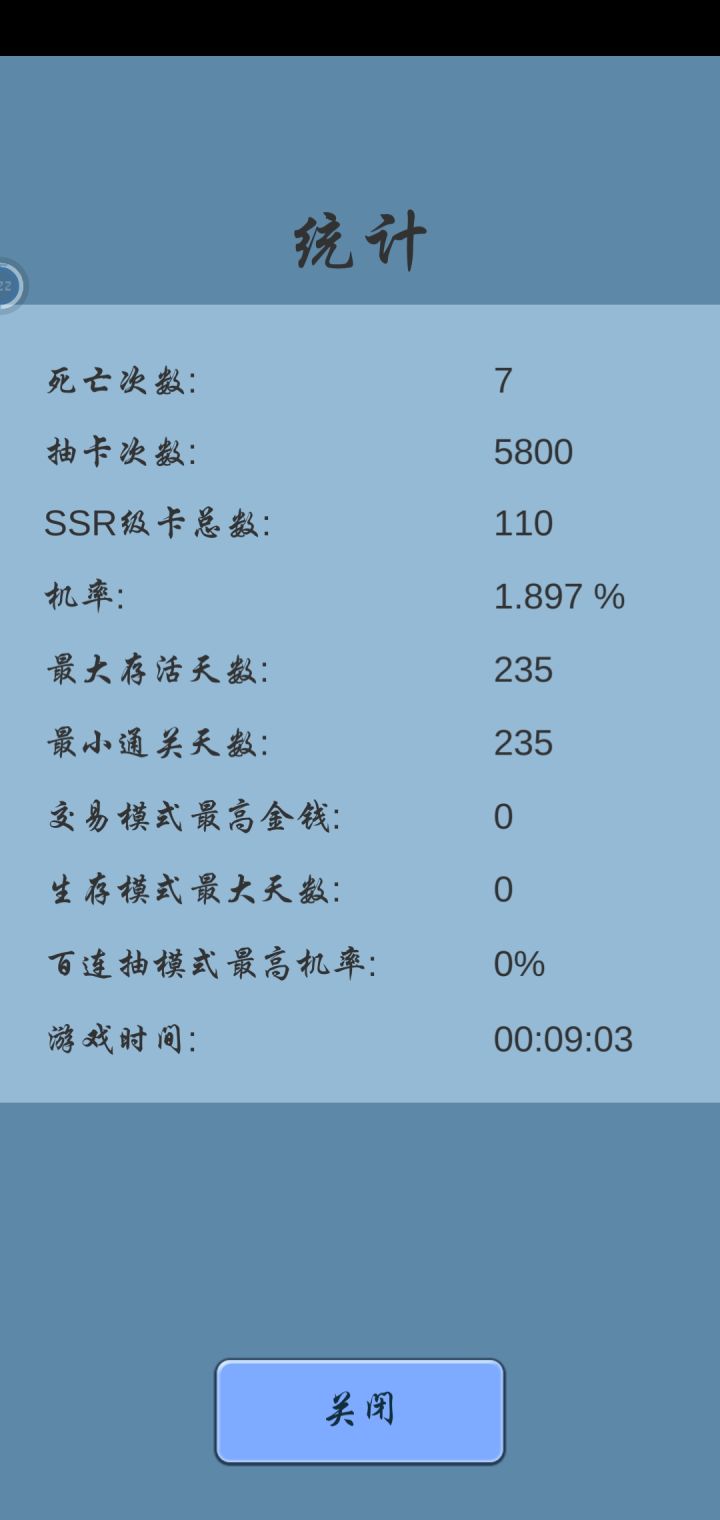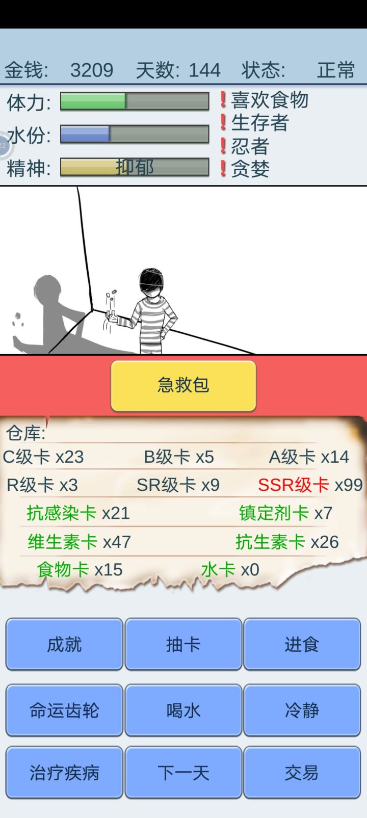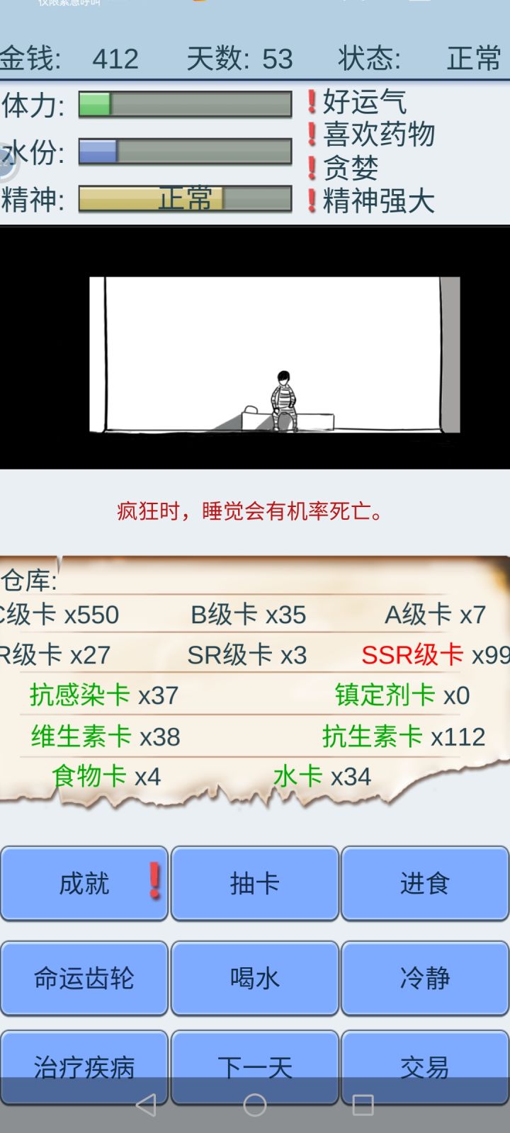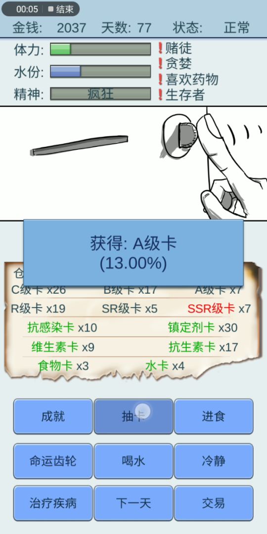 说一下通关经验,开局最好没有debuff,我的是好运,忍者,贪婪,赌徒。前期主要是活下来,商店有吃的换吃的,有水卡换水卡,齿轮等级低,前期很看运气,能活下来就行,到中期物资攒起来就可以卖一些物资,那个贵卖那个,留一点够用就行,我那局水很贵,能卖六七十,镇静卡很重要,中期能换换,不要卖,是伪永动的关键,精神好运气好一天能有好几百抽,游戏进程会大大加快,ssr。。随缘吧。