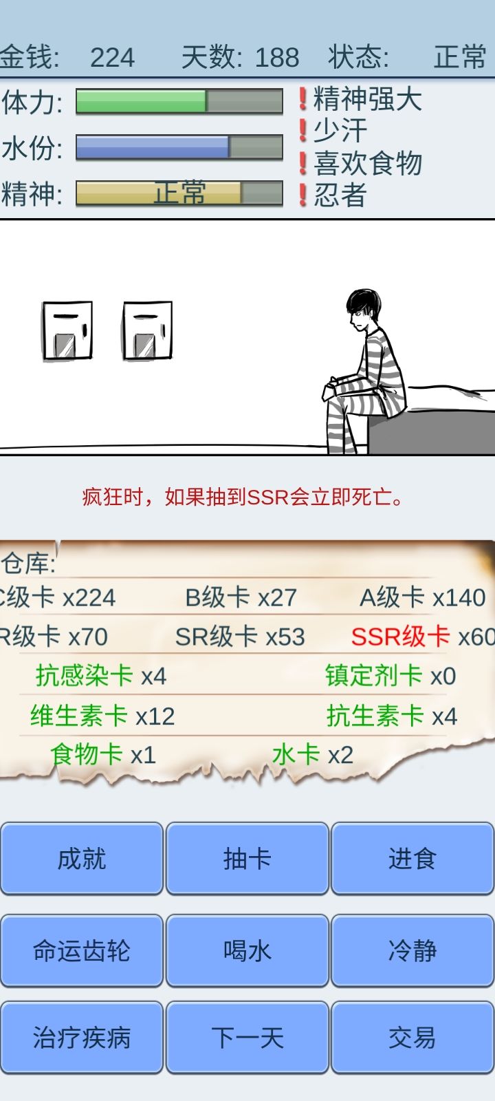 运气差的朋友们,在保证自己能活到365天的前提下,行刑之日选择复活即可继续玩,抽到100ssr仍可触发释放结局