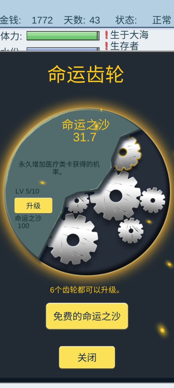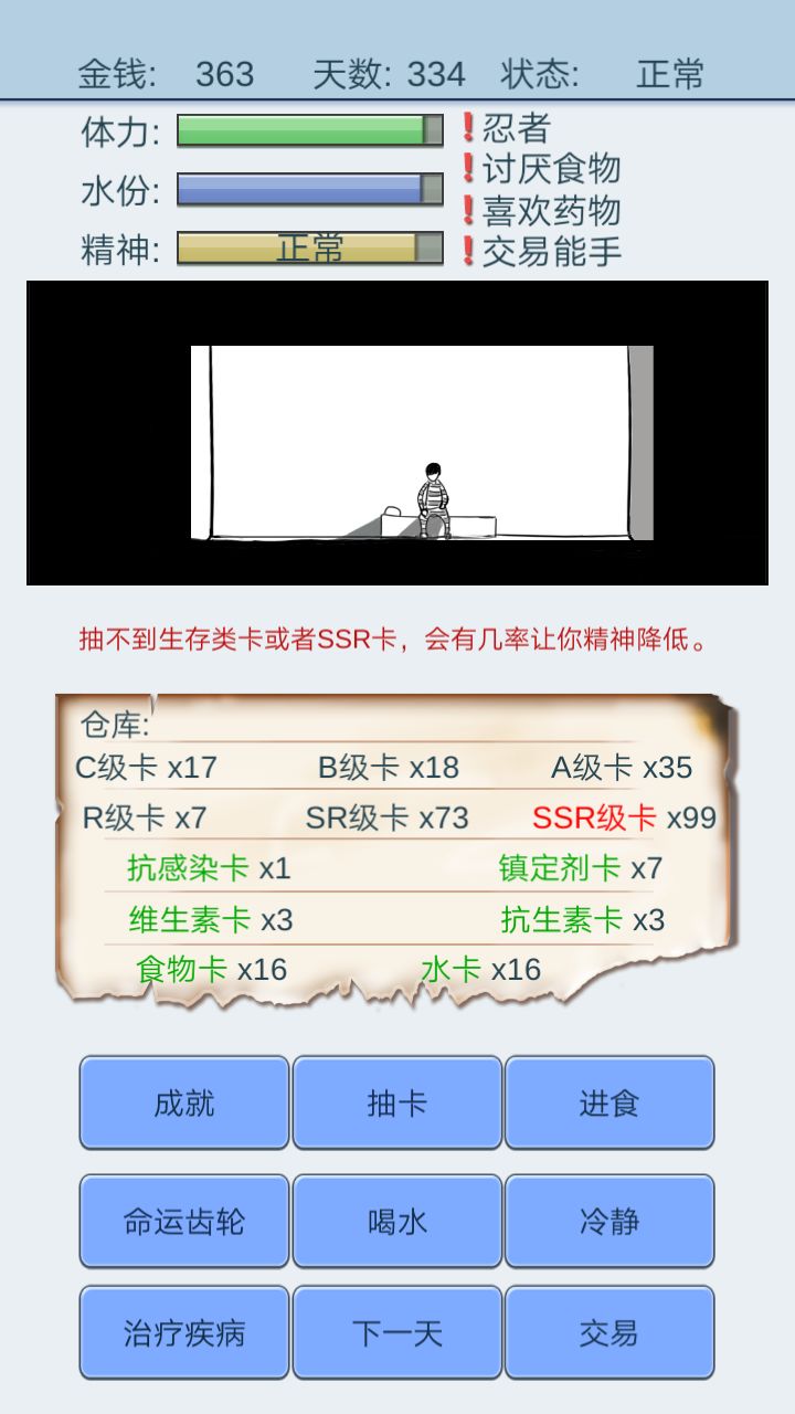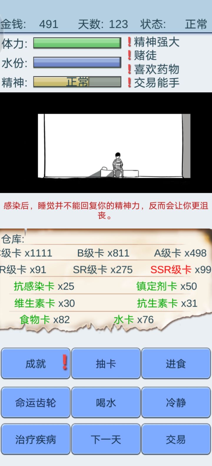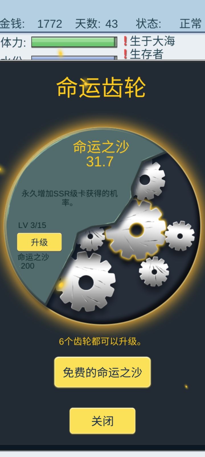 无敌天赋,齿轮都升食物和水,ssr几率只生一次,镇定留着保精神,商店啥时候水和食物卖的贵就可以开始,抽卡,卖除镇定外所有,循环下去(本人亲测无敌,一次通关,下方有数据)