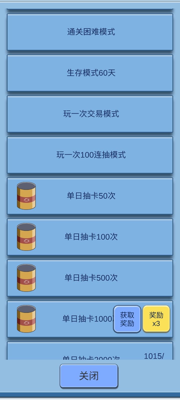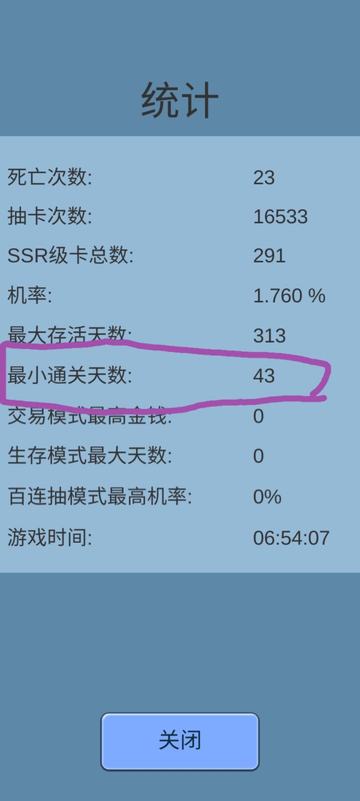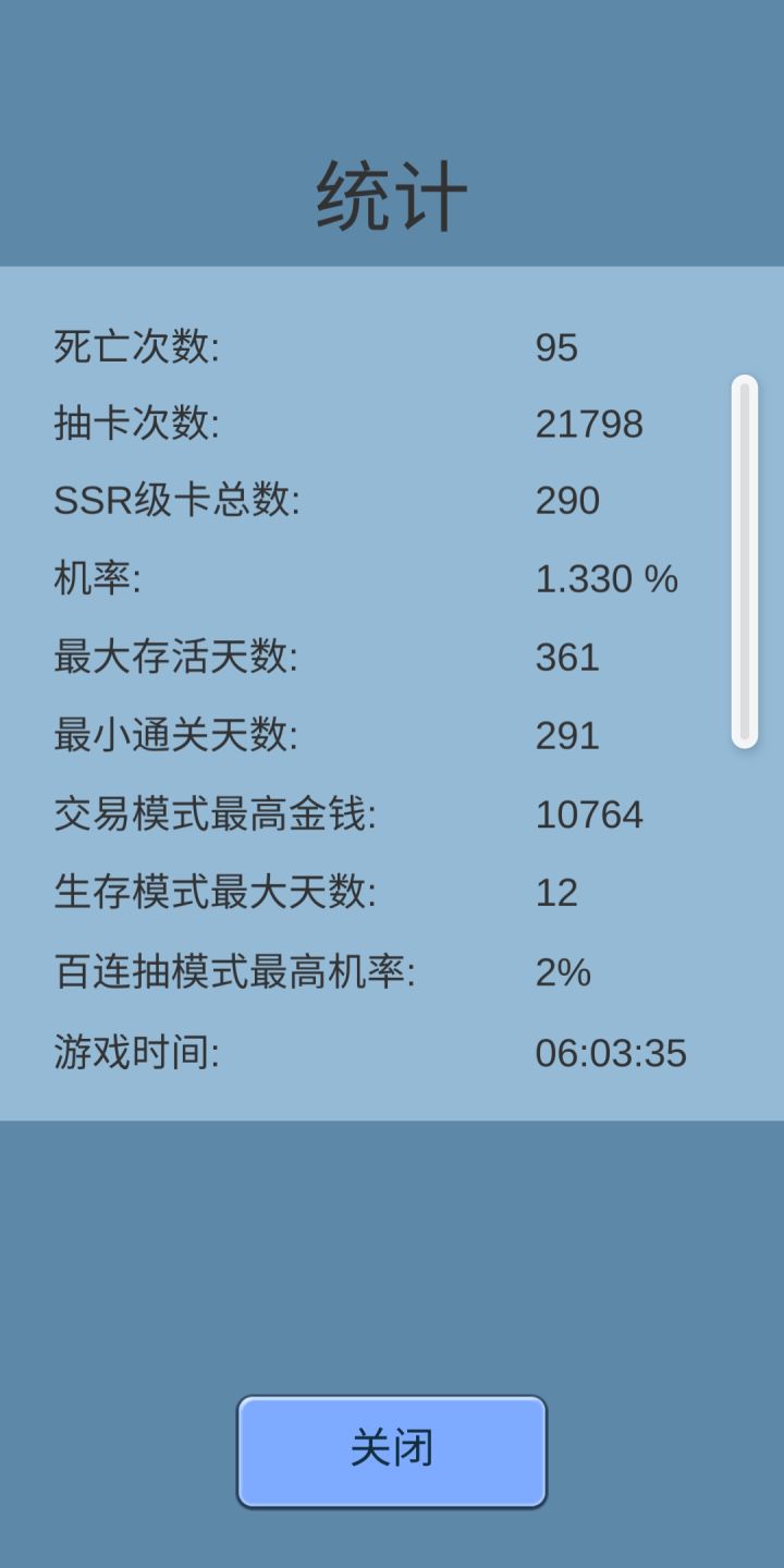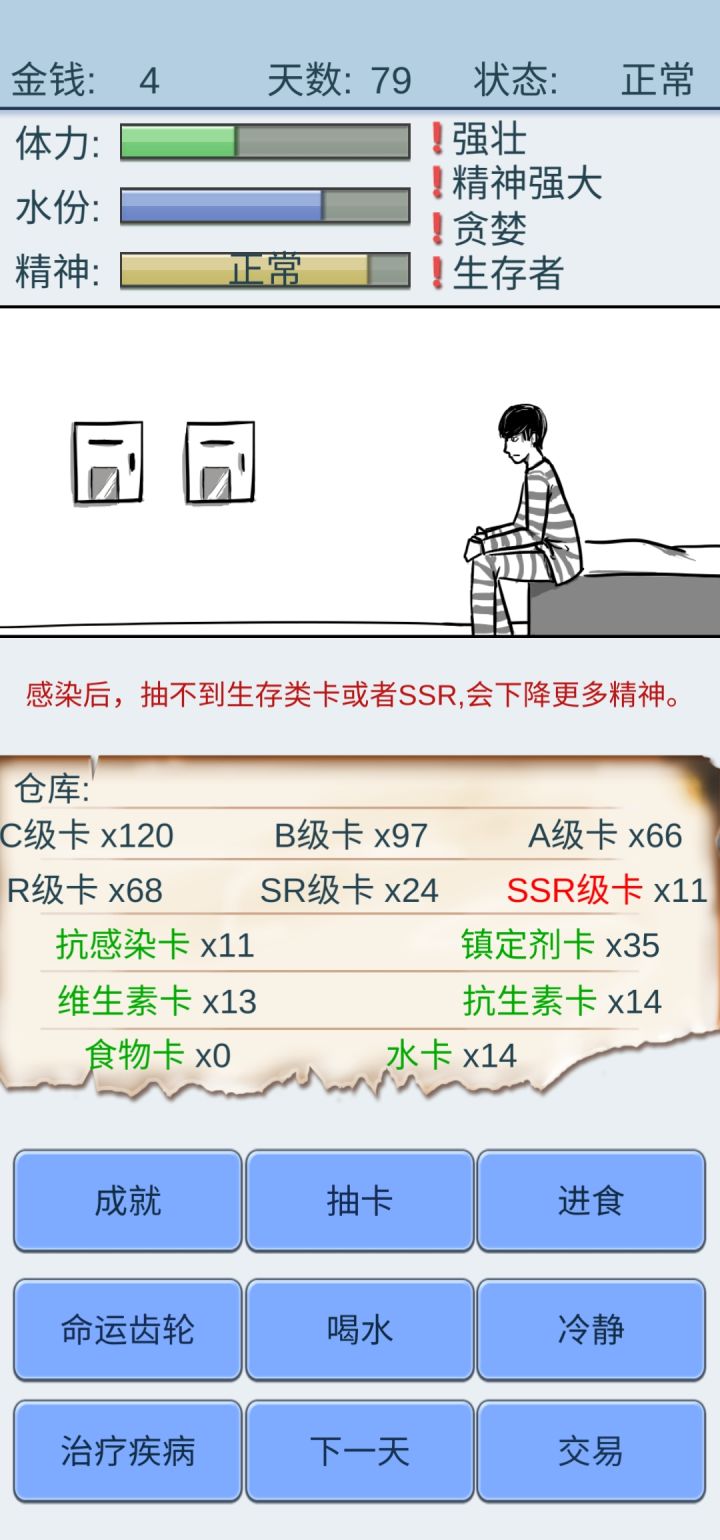 无敌天赋,齿轮都升食物和水,ssr几率只生一次,镇定留着保精神,商店啥时候水和食物卖的贵就可以开始,抽卡,卖除镇定外所有,循环下去(本人亲测无敌,一次通关,下方有数据)