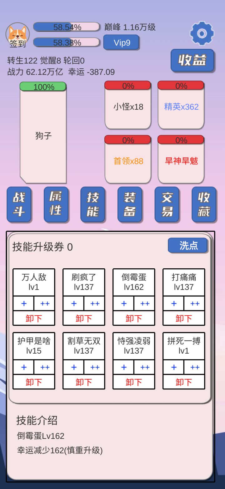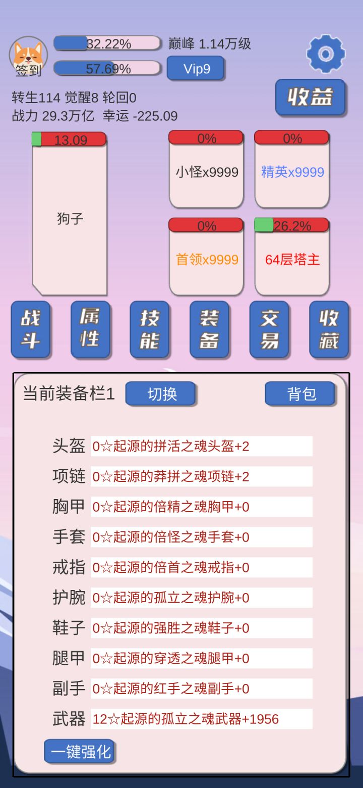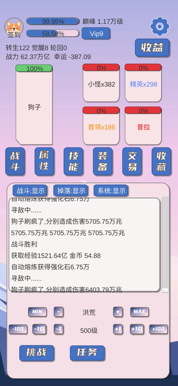 游戏QQ群号 582227019 欢迎进群交流常见问题1.幸运有什么用幸运越高遇到的怪越少越弱,反之遇到的怪越多越强建议新手前期满幸运越级刷怪,后期可以高难度低幸运刷强力怪2.巅峰等级有什么用每级获得属性增幅和巅峰点(微量)3.怎么爆更高品质的装备装备品质与怪物数量 怪物品质以及难度有关4.VIP有什么用怎么获取VIP全靠挂机积累,或者观看广告兑换经验10%最终攻击10%最