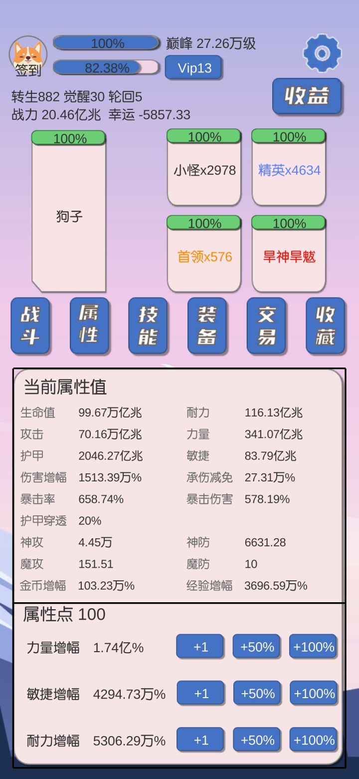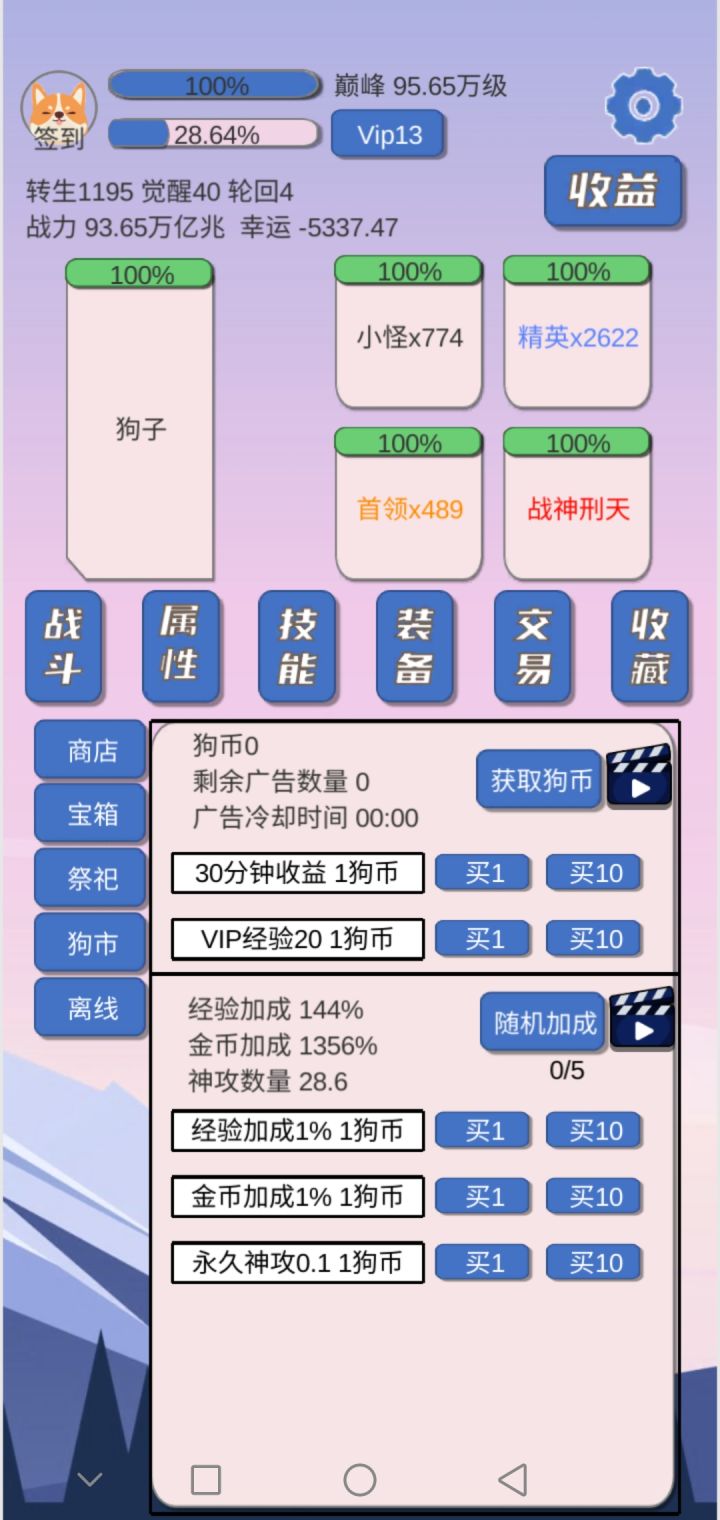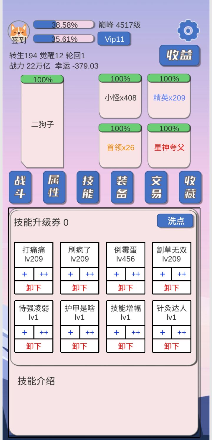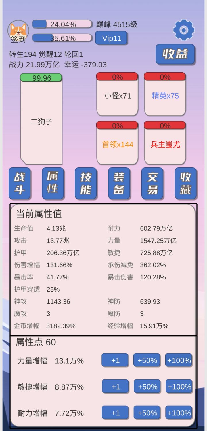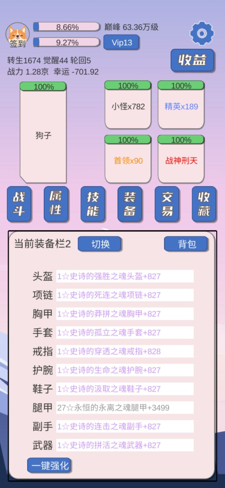 轮回没完美重开了,闲着无聊写个攻略,我才一轮,懂得也不多,别喷一,新手0觉得走力量,幸运100,先开箱子把装备附魔无知,倍怪,孤立,强胜,智者,然后凑恐怖5个,怪物满55等级加一难度减11等级,能秒杀就可以,大概两个多小时能到巅峰,技能是护甲是啥,打痛痛,恃强凌弱,针灸达人二,转生装备肯定是上古啦,没有的话就恐怖7,莽拼,拼活,汲取(血脉也是,能过万倍)。有的话就上古9,连盾,技能是护甲是啥,打痛痛,拼死一搏(盾牌猛击),技能增幅,恃强凌弱,割草无双,硬板板(带盾牌才带),针灸达人三,转生技能你要看神攻等级,要是低于平均数就来个伏羲琴,高的话你有钱随意,平均值要大于0.5小于1,利益才是最大化,实在打不过就10神攻的买,能秒过两三个boss四,我想完美轮回啊😭😭😭五,好缺钱啊😭😭😭