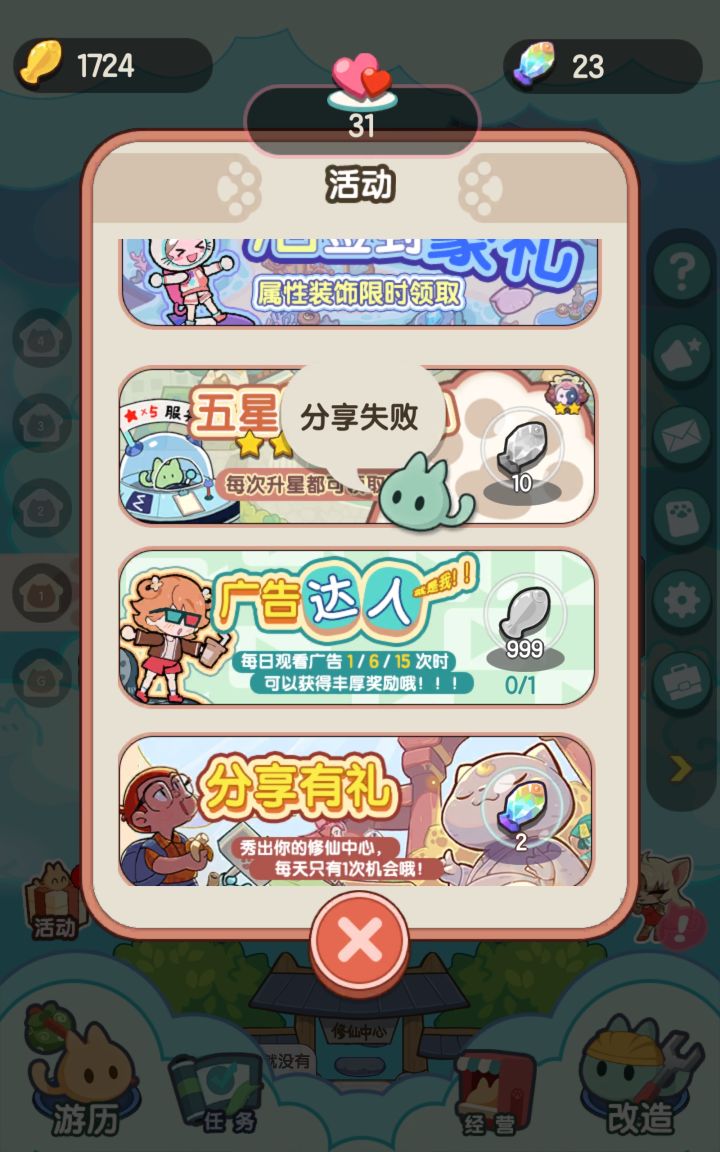 补签需广告看不了就算了…不补签后面的都不能领了,有点坑吧!!!特意去试了下…所有的广告都看不了,全都是加载中…分享明明成功了,为什么每次都告诉我分享失败啊???