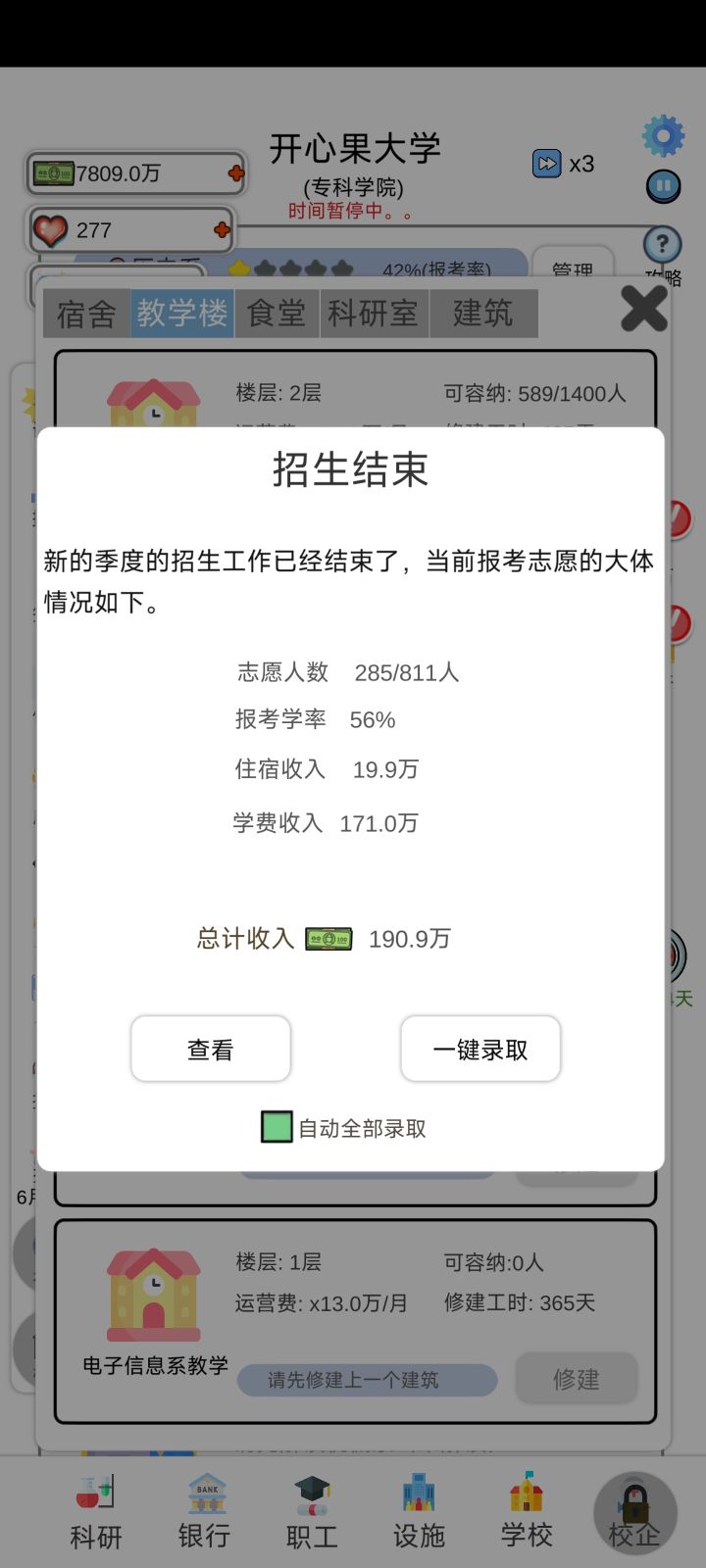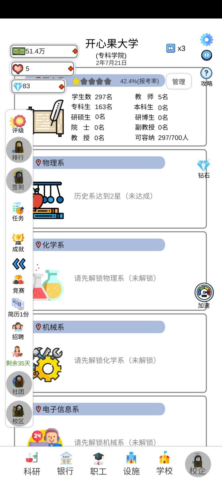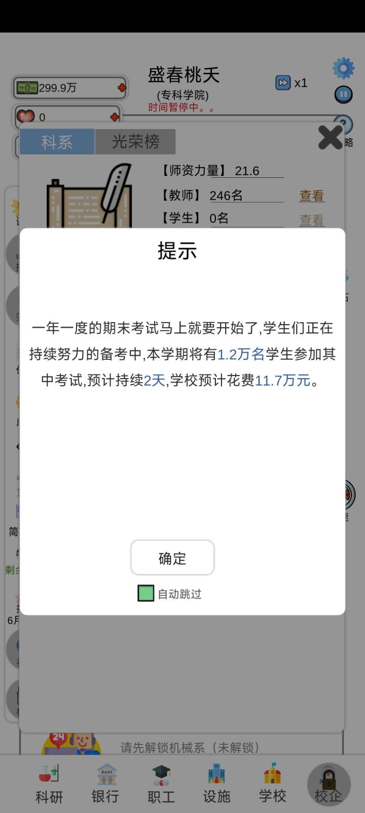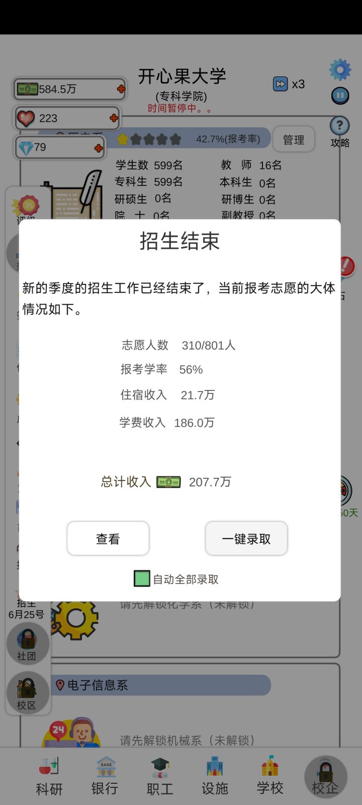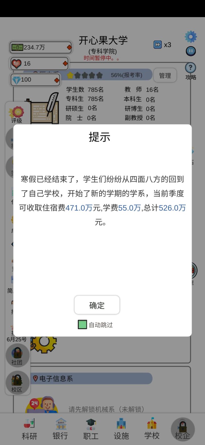 接连两次满足了大学升级条件,而且还有弹窗通知大学等级上升,但是大学等级都没有任何变化
