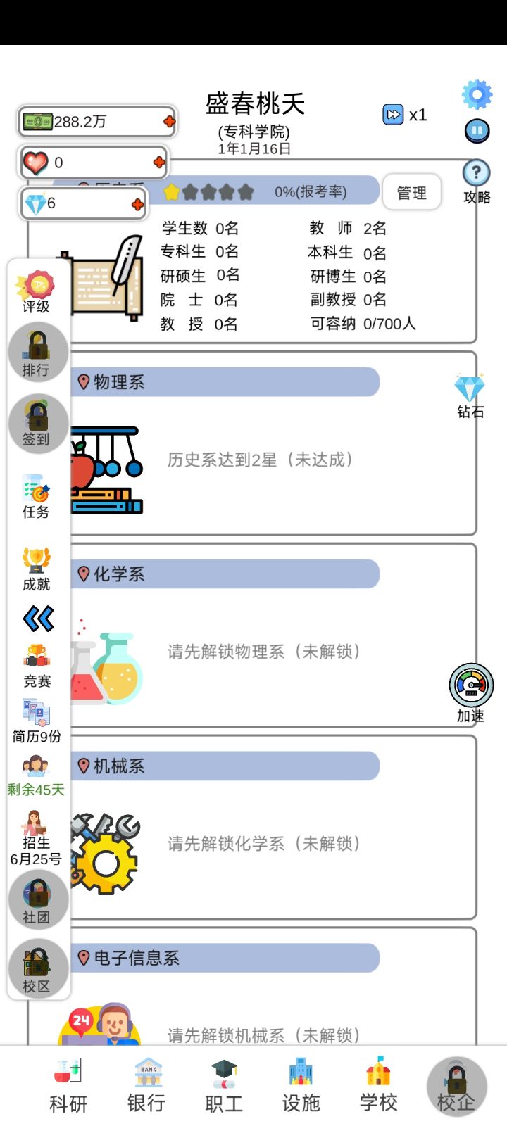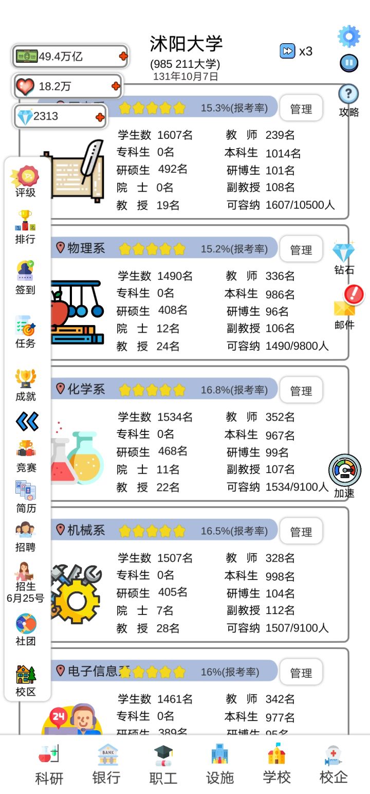 此游戏仿照以校之名,但是有一些个数值就很离谱成就系统的奖励给的也太少了吧?费劲费力弄到成就就给那么点儿?学生人数的多少,到底是以师资力量,宿舍量,还是什么原因来决定的玩了三十年愣是没有荣誉学生?开局第一年前半年合着光浪费钱了,很亏啊