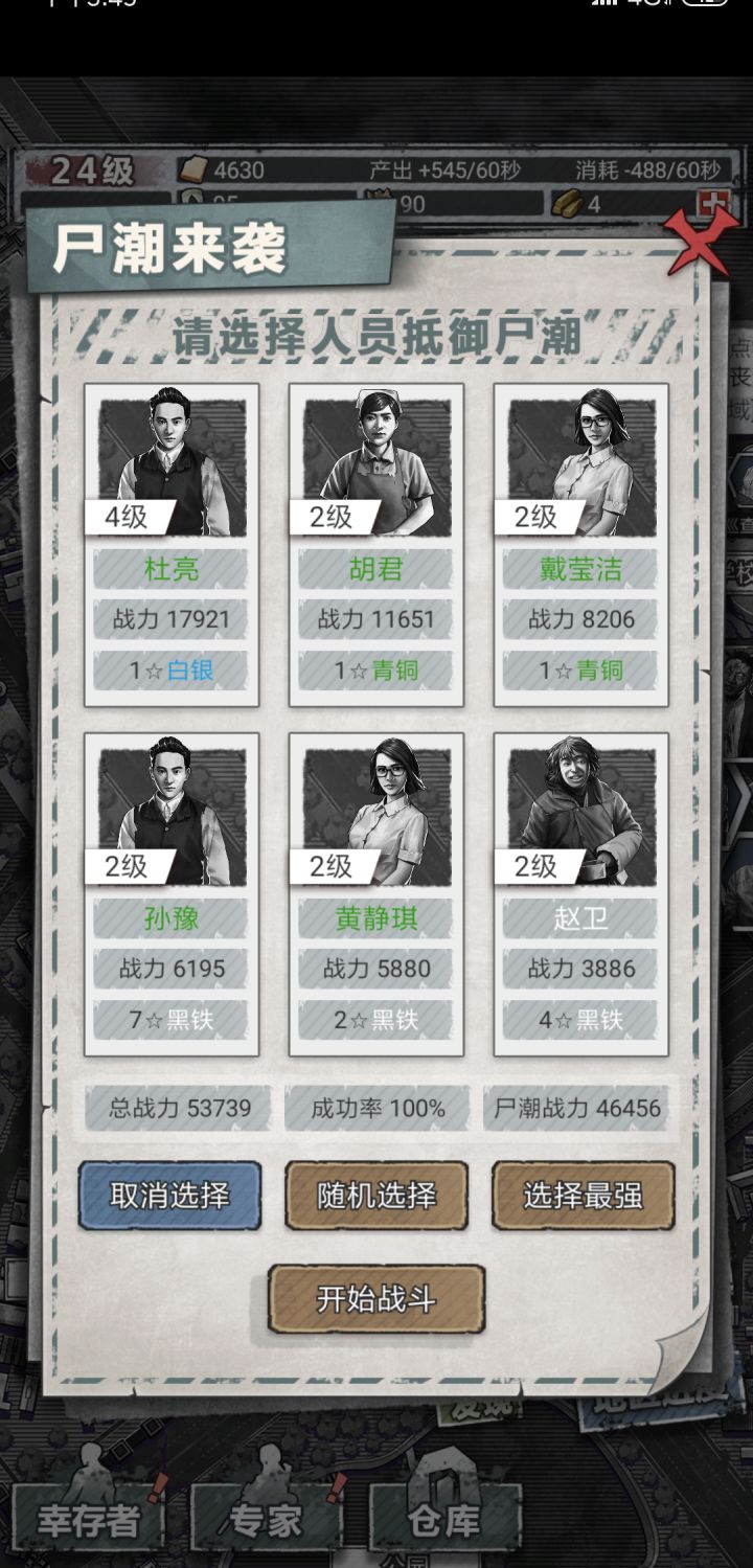 玩了2小时😁目前尸潮属于是轻轻松松。纯种田游戏 攻略就是直接种田和房子拉满,扫荡挂满。一直点免费装备和补给以及竞技场。资源起来了就做饼干给最高战力吃。后期就是强装备。属实无聊,难度在这种福利下基本等于没有,幸存者等于打工人,死活压根不影响也没必要特别培养谁。