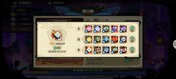 本期平民试炼打法~第一套,我没游侠所以用了大眼,其实也可以换成吉他,会稍微弱点,大眼的核心就是有伤害加成的时候合成打爆发第二套,试用的14+5毒加火矛带队,主要就是看运气合出两个4星火矛变火王然后冰傀儡拖一拖,因为有夏花,软泥怪也还好第三套,最看运气的一套,总得来说风雷50星才有实力,还得躲软泥怪,还得看爆伤,我爆伤比较低,900不到,不然也许能打30分
