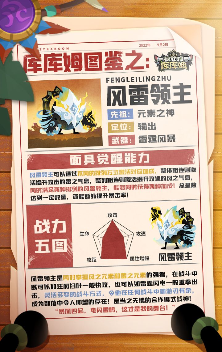 大家好,这里是库库姆的【库库】,欢迎来到今天的今天要给大家介绍我们部落中的一个库库姆。在库库姆的群体中,掌握了自然力量的库库姆往往拥有最惊人的战力,尤其是将这种能力转化为强大的攻击方式的话,更是拥有可怕的效果,而有这么一个库库姆,他掌握的不是一种自然力量,而是两种!他就是:化身战场的风雷,将敌人摧毁于自然的巨响之中,这种强大的库库姆你爱了么?————————风雷领主等待你的召唤~!后续还有