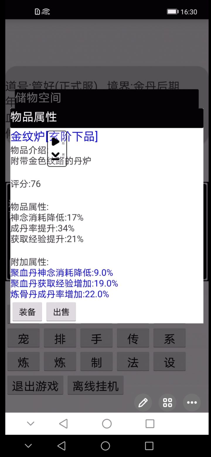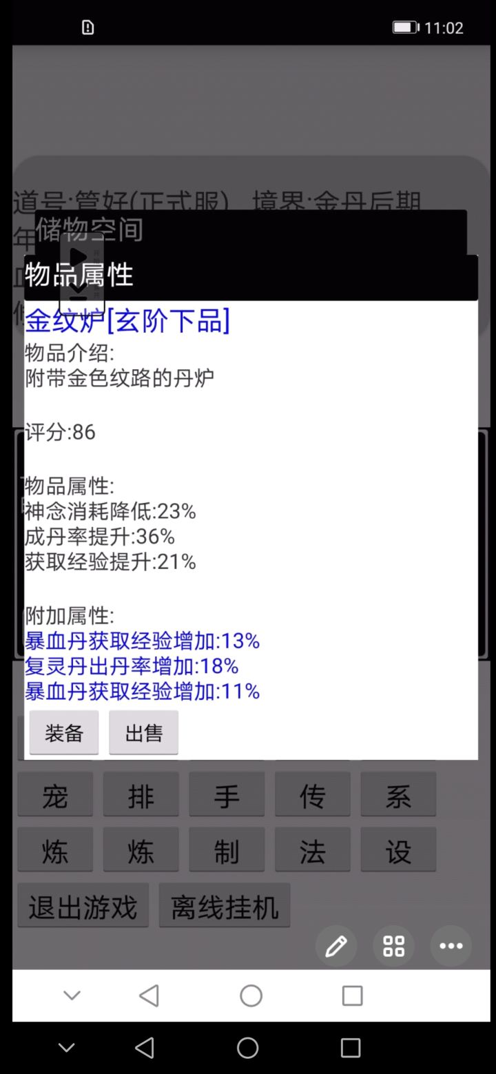 2、推荐炉子,黄的时候,白晶炉或者金纹炉都可以,这两种都是玄下,舔包可得,白晶加经验,金纹减神念加经验。等到玄的时候,神念数值大,神念会有作用,推荐金纹炉练级。