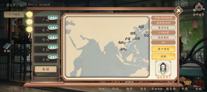 这把前期比较胡,书画和石头都是赚很多,很早就开了漕运,后期海运开到了天竺,可惜官运不行,没开出征战。