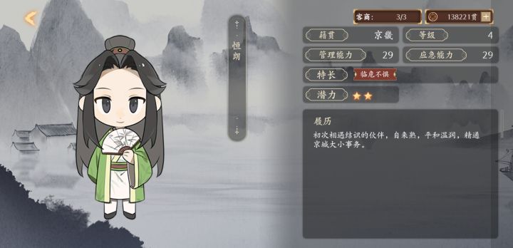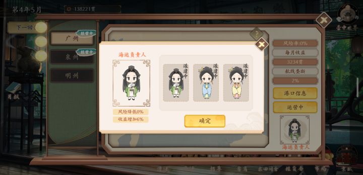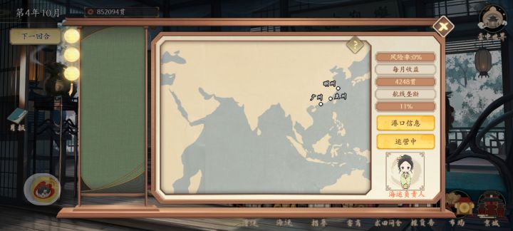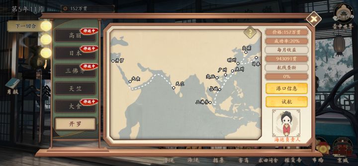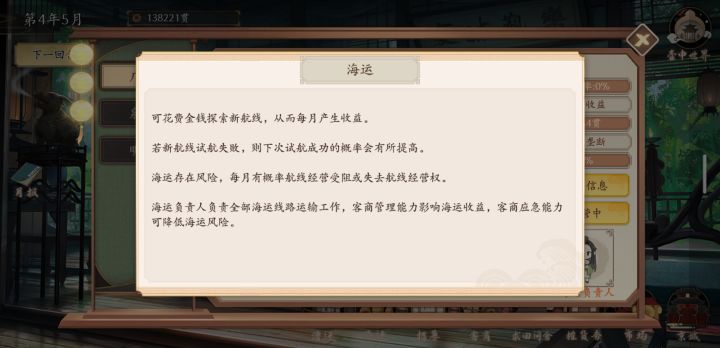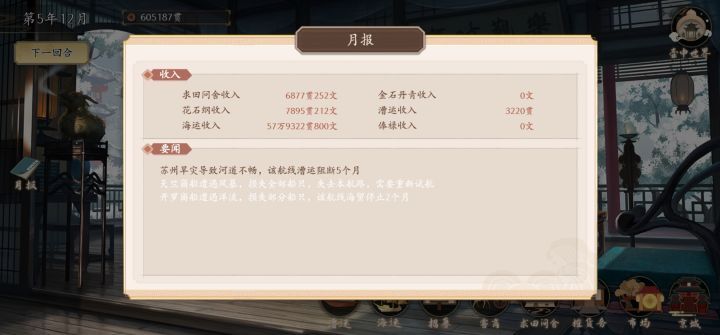 京城的行动点数在中举后除了开故事就没啥用了,之后会不会再开发点其它作用吗,比如开出的故事能给那一个月的经营加buff。故事看完第一遍后开始无聊了,需要一个跳过和故事收录、成就(不过这个应该是有规划了,没做出来吧,如果没猜错,之后应该是在旅行数据那里)仓库的货物利润是以第一次购入的价格为准,之后多次购入重复商品不太好计算利润时间多次跳过是不是加个确认弹窗比较好,之前点快了误触过,或许还可以加个