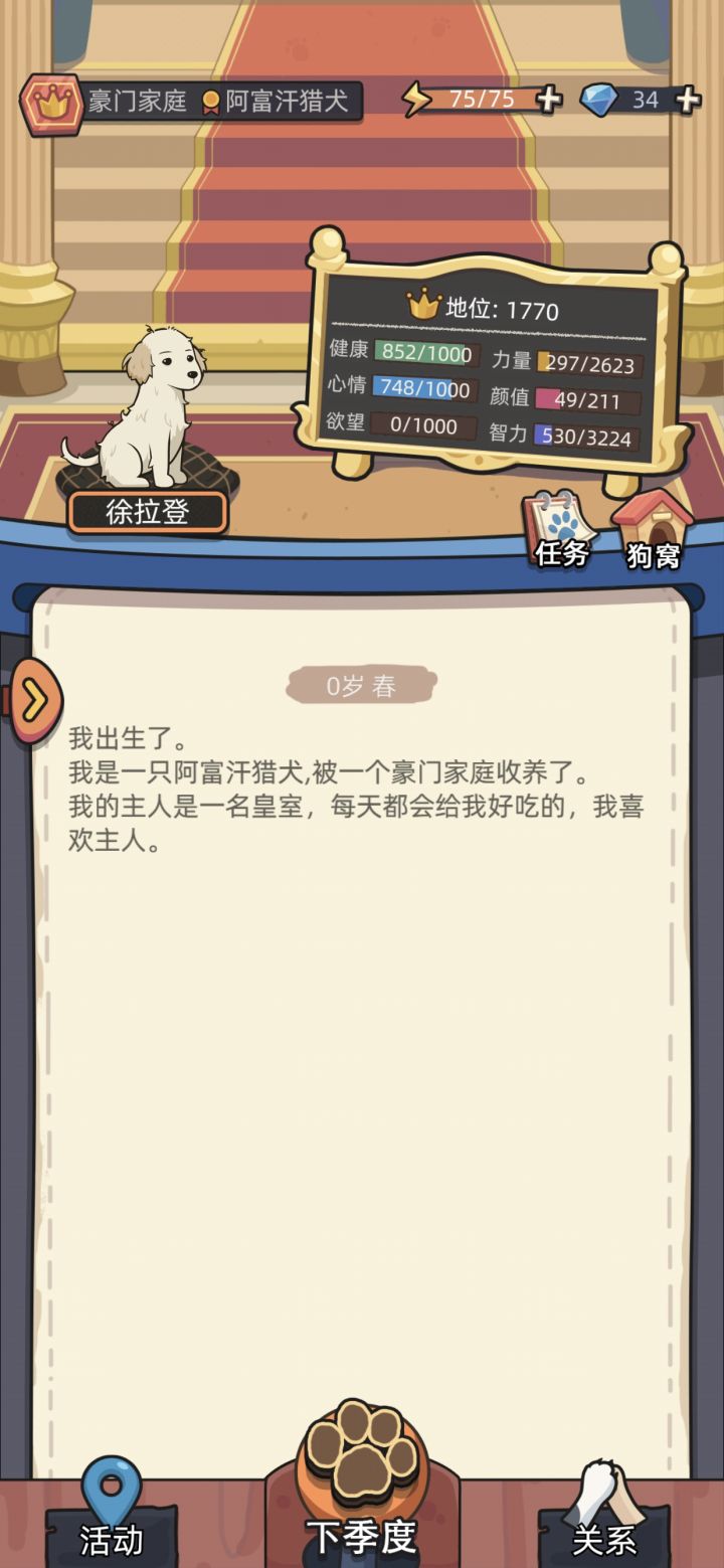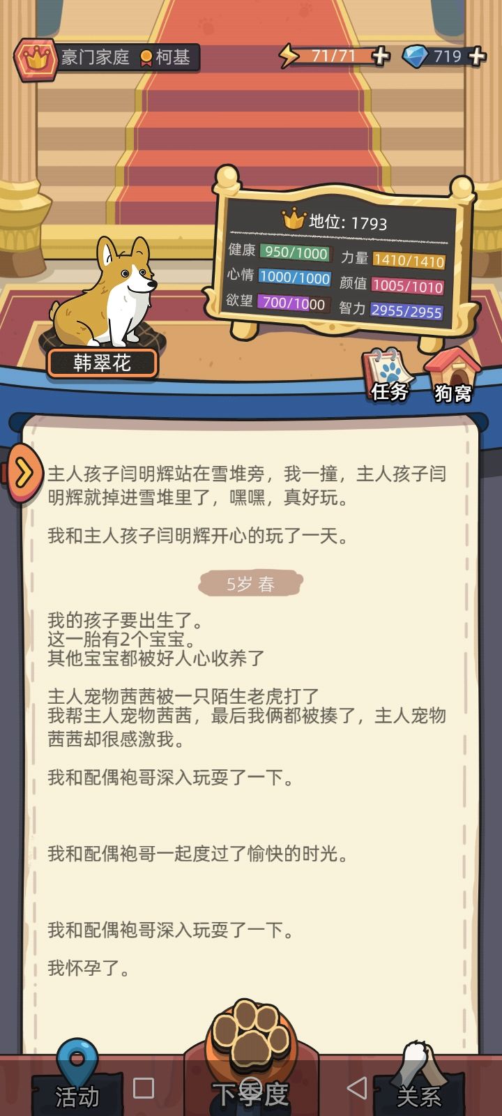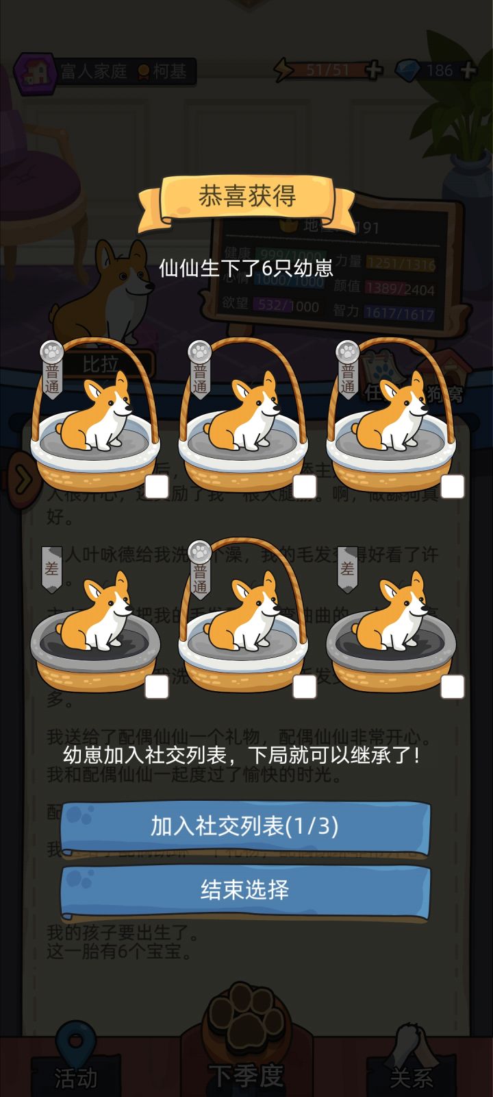 前期就是先翻垃圾,然后交保护费,找伴侣 先生小狗保证有后代 靠钓鱼补完属性,最后剩的一点靠主人训练,多余的鱼放胶囊 属性越高出好后代几率越大 然后就是一直刷酸奶,刷酸奶,点技能 中间顺带生小狗,我这里是为了下一代生柯基,就一直柯基 保持健康,保证自己不因难产而死 点满技能之后,如果有合适后代了,请直接进屠宰场 然后重开,看到我下一代基因了吗,37%萨摩耶,37%柯基,再随便找只柯基,下一代就能拿到柯基血统了 如果不懂基因的话,看这里 - 含有18%以上基因的就基本可以出那个品种了,只要再找对应品种对象就行。但是还是建议土狗开局,因为土狗带杂基因,开图鉴几率更大。想要拿具体品种,比如要拿柯基和萨摩耶,就要至少两代都找柯基或萨摩耶,提纯基因,出的机会就更大。