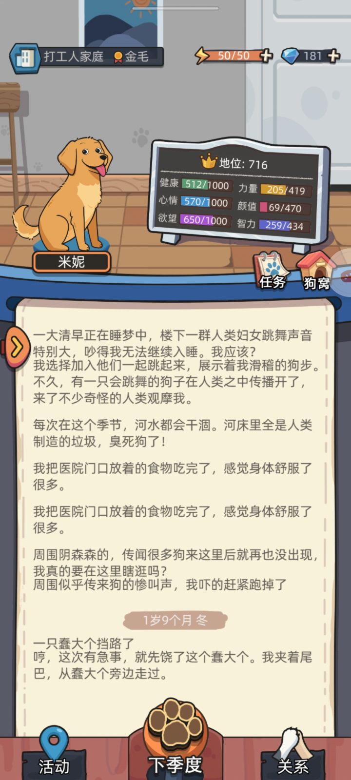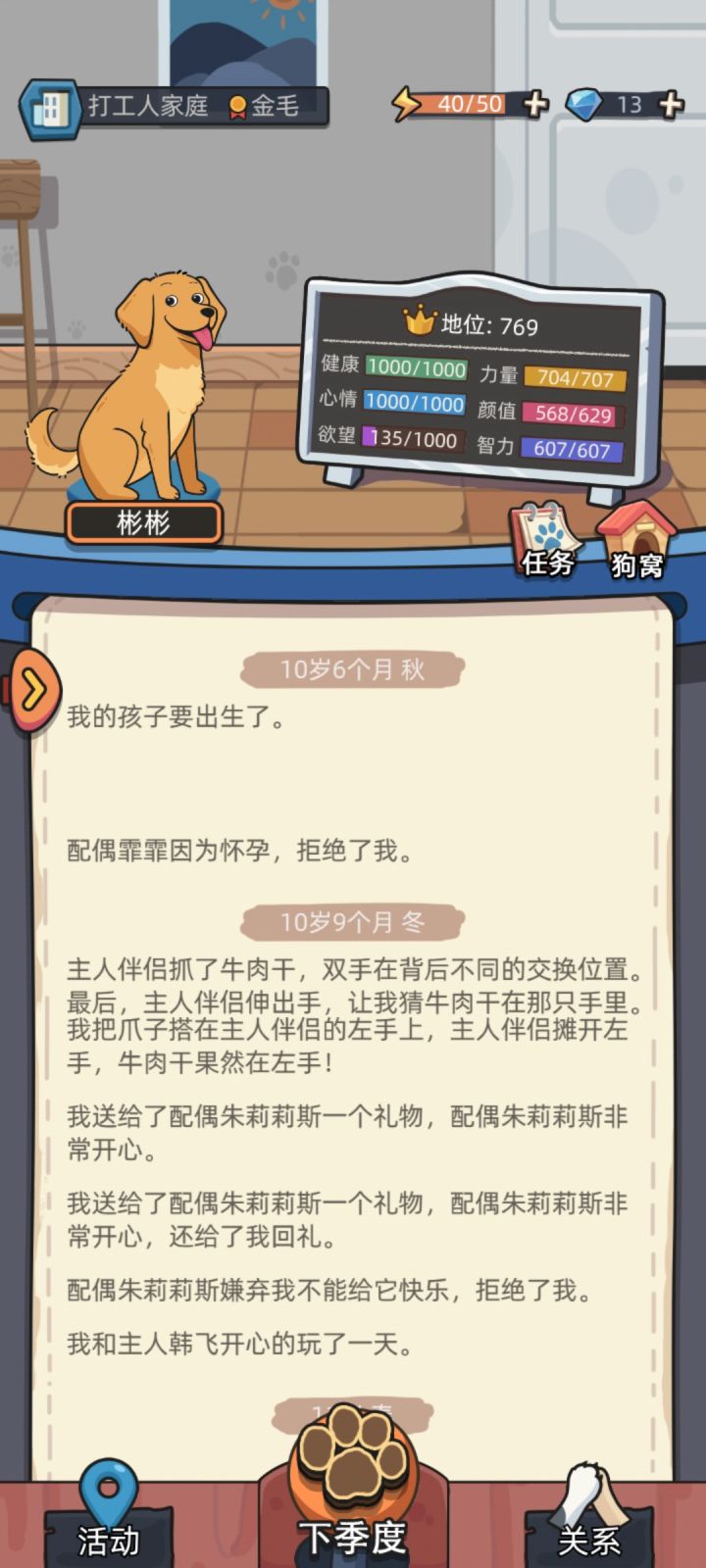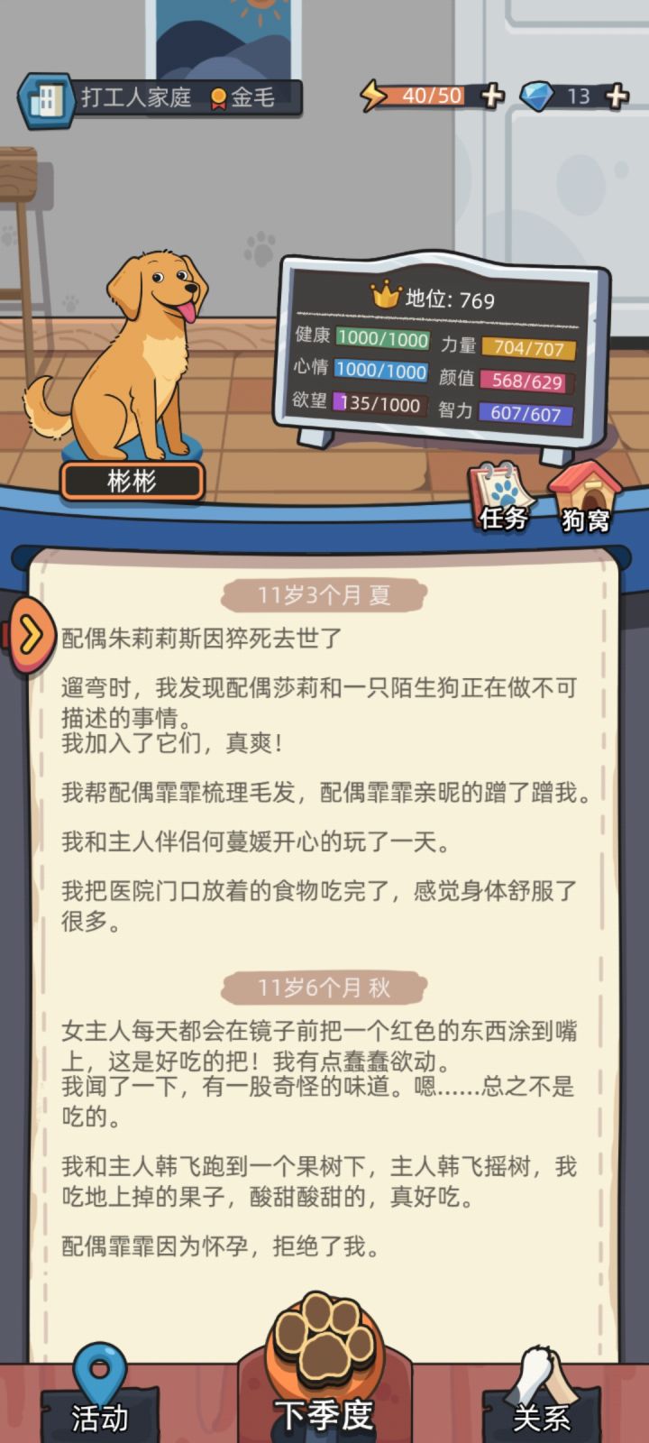 一代活了八岁 勇斗小偷死亡,二代活到十岁勇斗小偷死亡,我就想问问,几岁可以不死,太惨了简直,含泪看了几十秒广告复活,现在十二岁,伴侣死了两个,主人伴侣也死了,现在朋友有法斗和藏獒,但是这两个要求的属性也太高了吧简直,要求九百多属性,我就算拉满都只有八百多(我是金毛,非纯血)