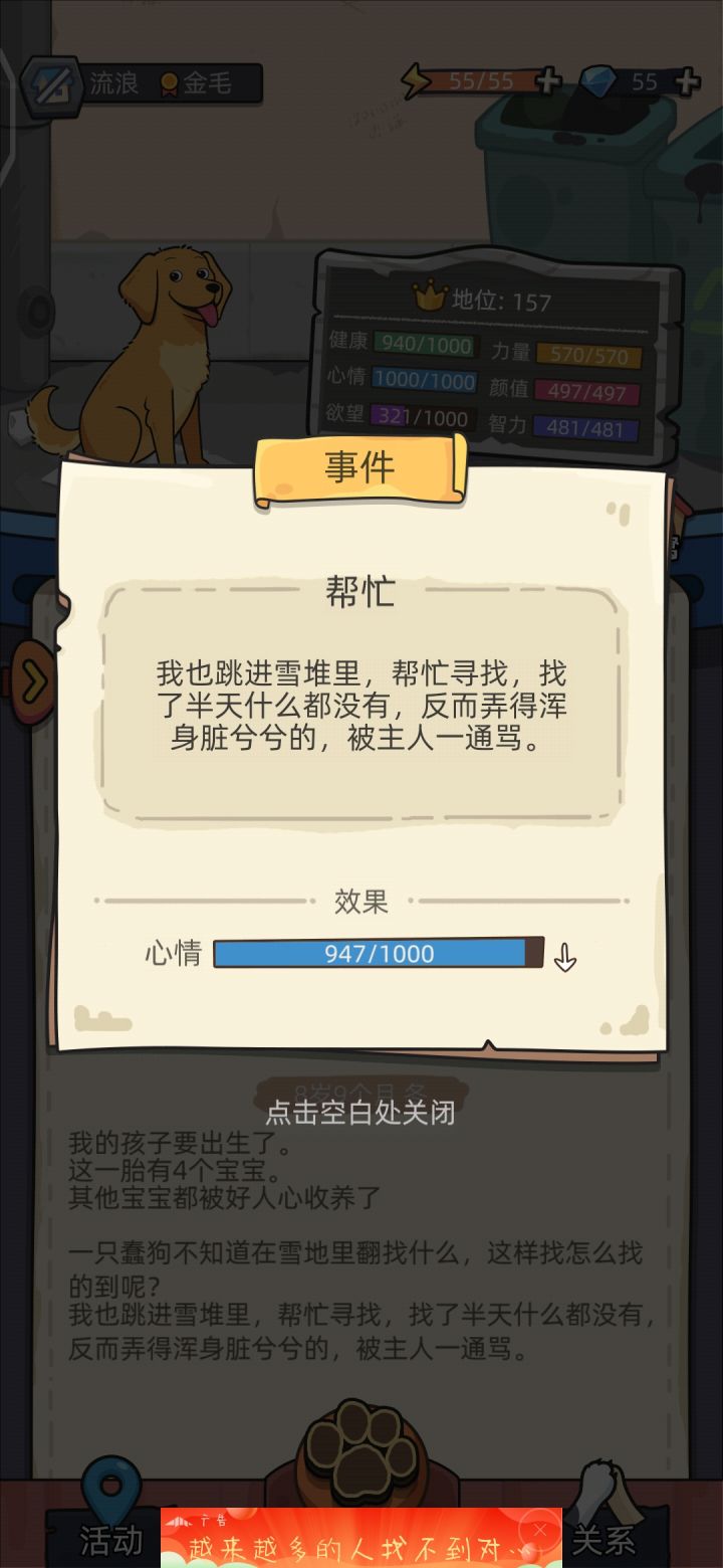 智力就差几十,能不能像人生模拟器一样整个转盘和签到增加智力属性的,这就差一点点我真的难受死了呀!还有我好不容易挤进富人区,完事成年主人得个癌症就没了我就流浪了,直接去屠宰场自杀好吧,流浪有啥用啊?