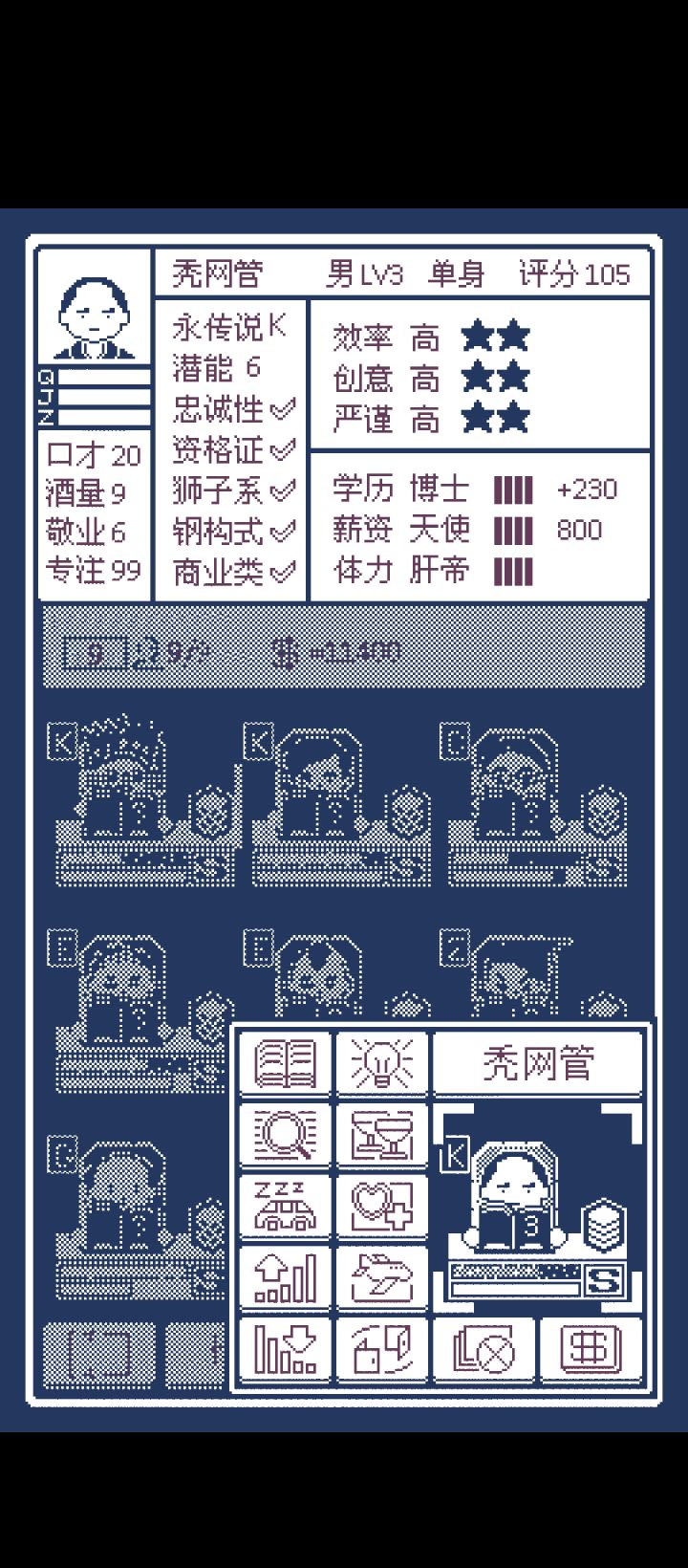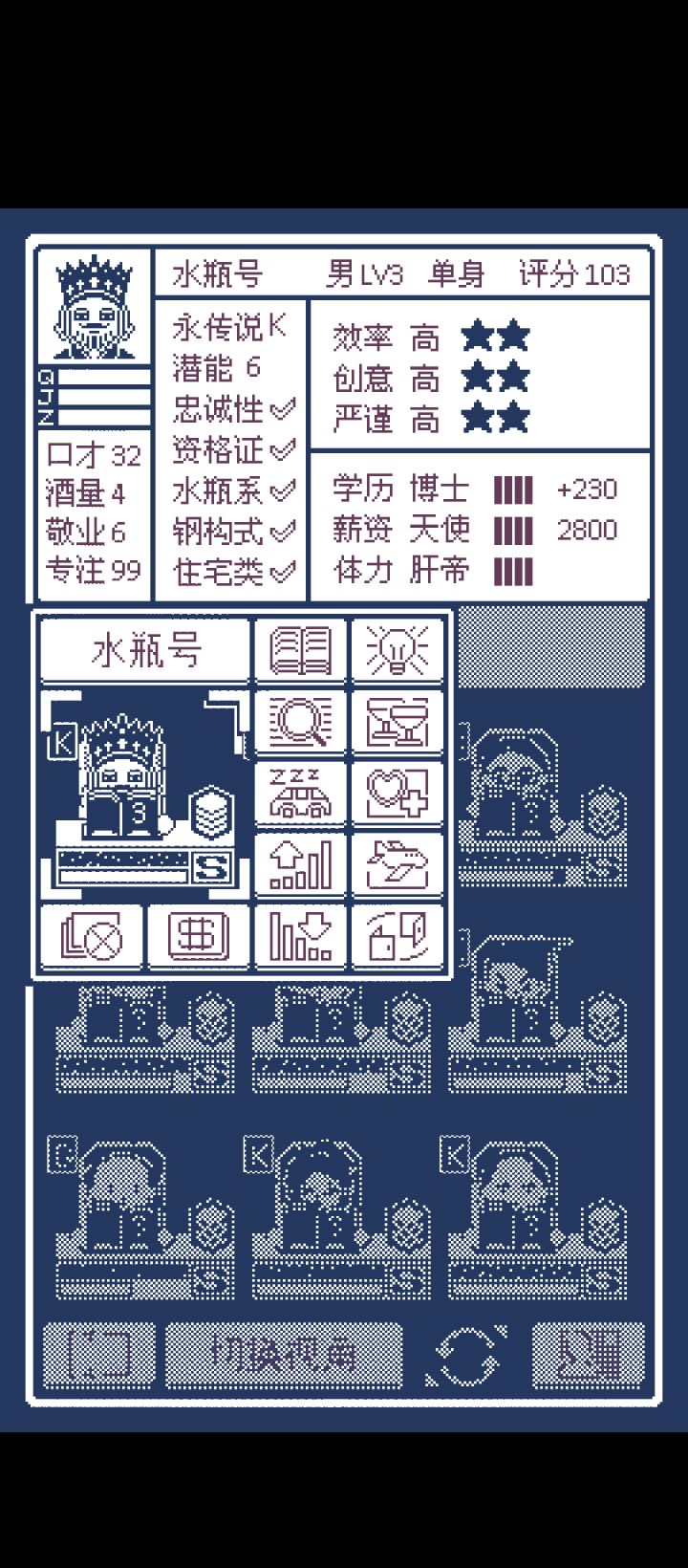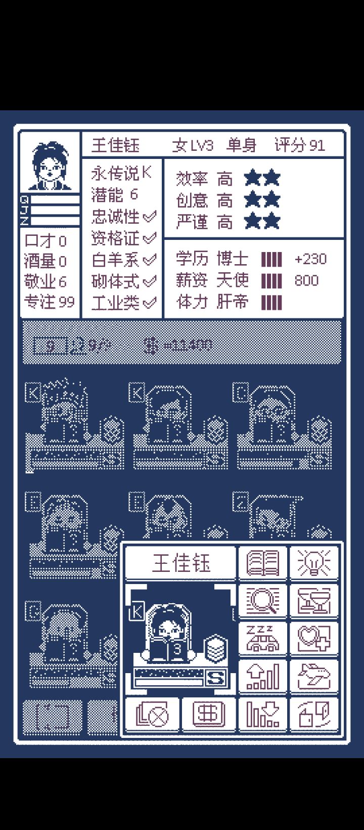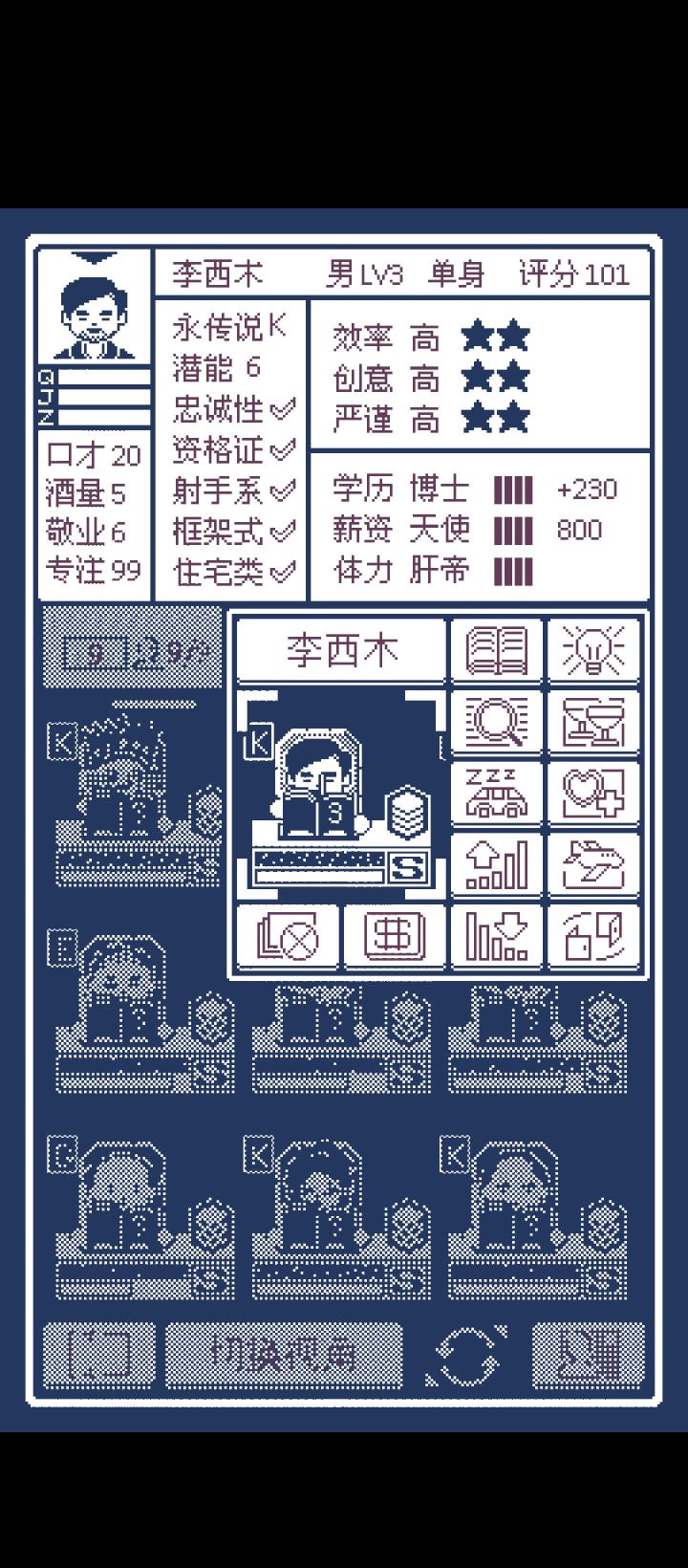 开局新手任务做完第一个任务放弃掉 可以获得一个隐藏人物—水平座 前期项目都靠这个大佬帮忙做开局每周必刷简历 尽可能挑优质的 虽然前期咱们有水平座这个大佬已经够用了 但是咱们还是得留着点备用招聘思路个人认为 效率>严谨>创意还有就是要注意学历(S)薪资(P)体力(B)这三个值学历分为专科本科硕士博士 个人认为这个值几乎没什么用 影响不大薪资分为魔鬼贪婪佛系天使 P那栏越满每个月发的薪资就