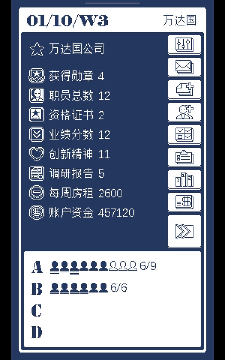 通关了,还是很有意思的一个游戏,但是确实新手教程不太清晰明了,我就我摸索的一些给大家做一个攻略吧。隐藏人物在第七条首先这个游戏通关目的是我们的目的就是接工程,完成工程去赚更多的钱,赚300w就可以通关了。游戏有4个工作室AB工作室都是接工程,做工程的工程队,用来赚钱的,建议一个工程队接大工程,一个工程队接小工程C工作室是工程管理部,去工程监理项目,结项目尾款,或者去写调研报告,用来兑换工