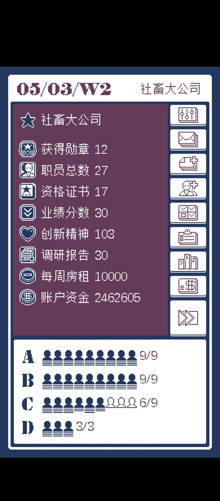 玩了几个小时该懂得也都懂了比如完美开局:拒绝你接的第一个单子就有概率(概率事件不必强求)获得一份高级简历(平均100分以上的 他可以带你打通前期所有的关卡)比如创新精神不够了就让闲下来的B组去出差就可以获得比如那个什么调研报告需要你开通C组让他们去做那个 (PPT+)想让他们做快点就点 PPTD组的话可以帮你要尾款和帮你统计一下工资什么的(D组的话还不是太清楚)