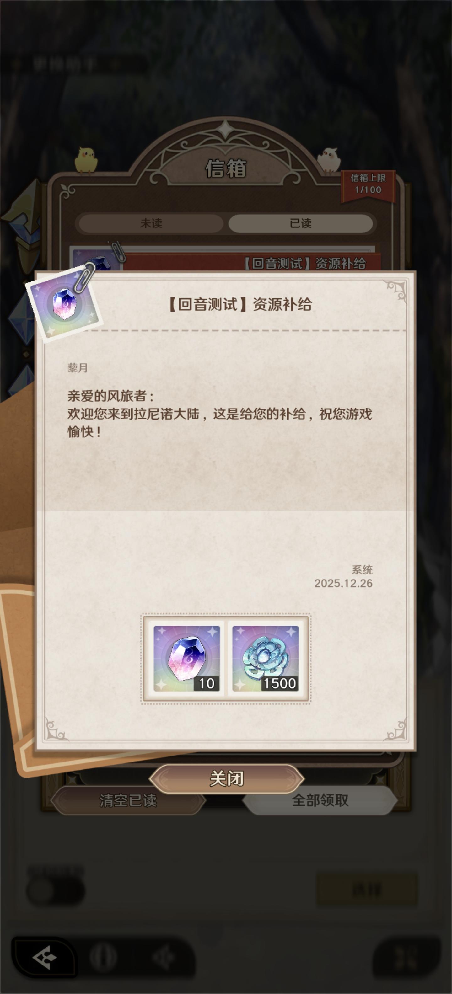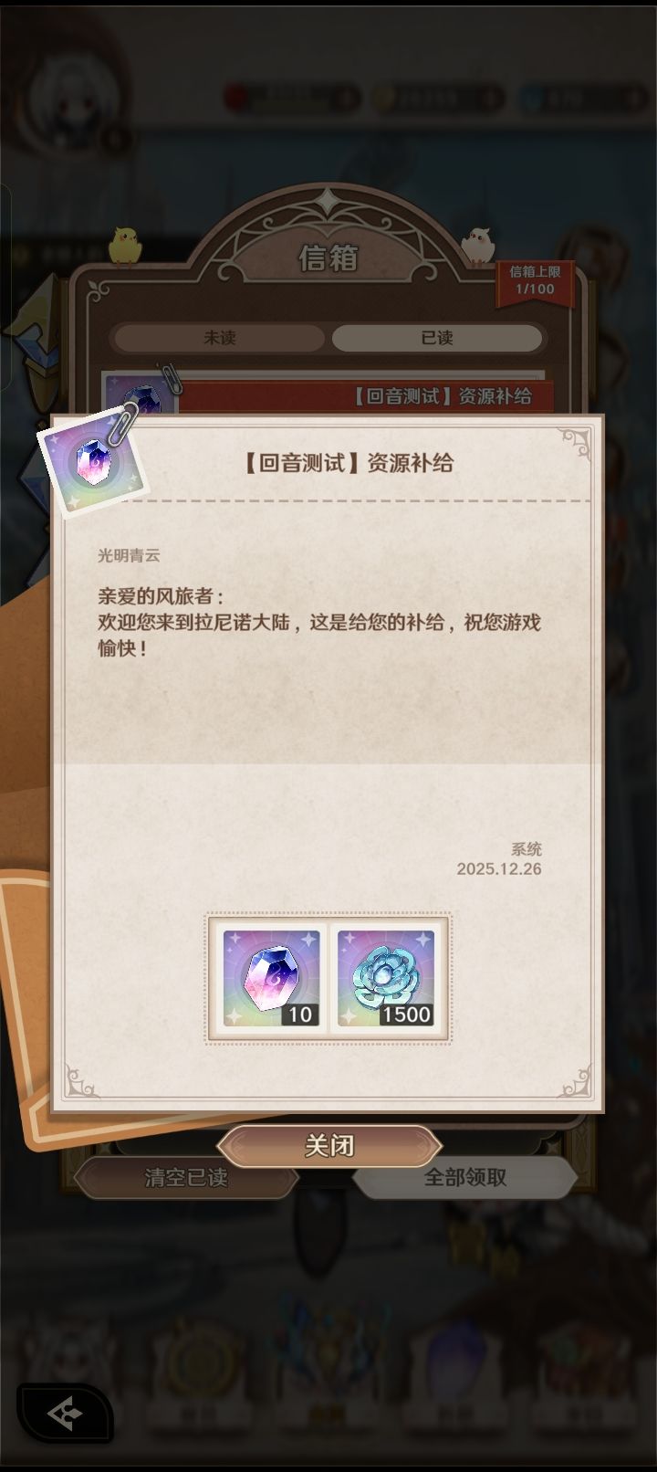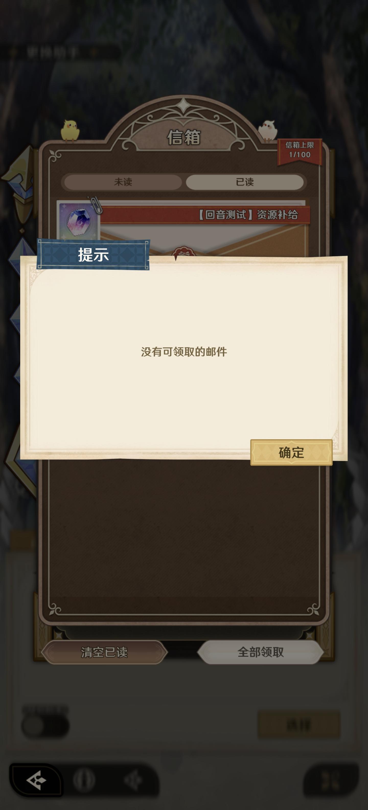 打不过1-10,然后又不让返回,只能下线重登,下线重登之后给角色升级了,然后打过1-10了,但是这个邮件是第1次看,都没有领过,结果显示没有可以领取的邮件