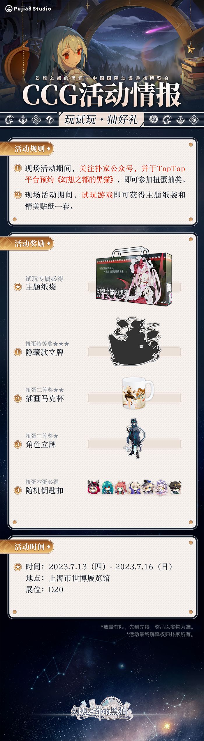 鸭鸭又给大家带来最新消息啦!《幻想之都的黑猫》将参展第十八届中国国际动漫游戏博览会(CCG EXPO 2023)!届时我们会举办游戏试玩,扭蛋抽奖等活动。欢迎小伙伴来我们的展位参观,千万不要错过哦! ▼参展信息▼时间:2023.7.13-2023.7.16地址:上海世博展览馆展位:D20