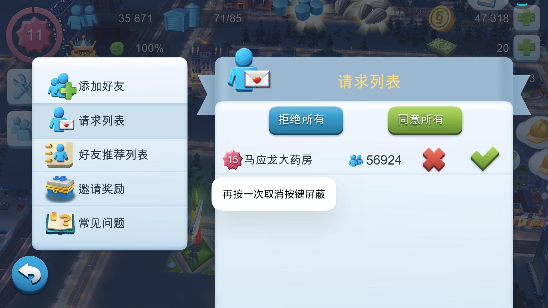 向官方提一个小的建议,希望优化一下好友列表。拜访所有好友的城市(去收礼物😝),在好友列表的后半段,去下一个好友城市需要滑动好友列表,每次拜访下一位好友都需要滑动长长的一段列表,真的是很累又很浪费时间。这种不重要的重复操作很影响游戏体验,希望官方能改进一下,比如加一个按钮,可以直接从正在拜访的好友城市飞到下一位好友的城市。希望官方能看到本帖👆