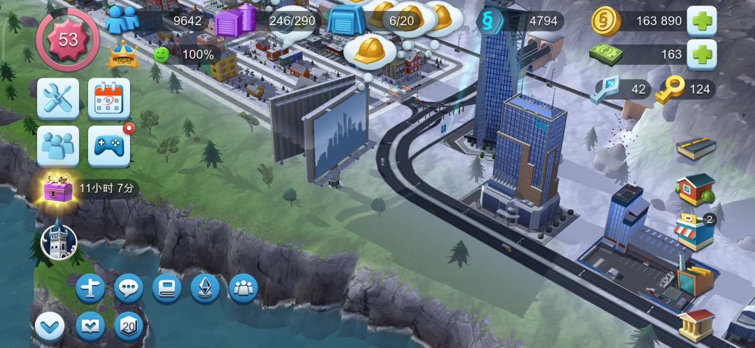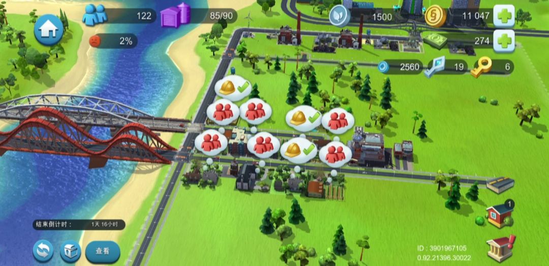 如图一四个建筑无法继续升级了,一周了没见安全帽,拖到无加成地区人口只有图二的数量。