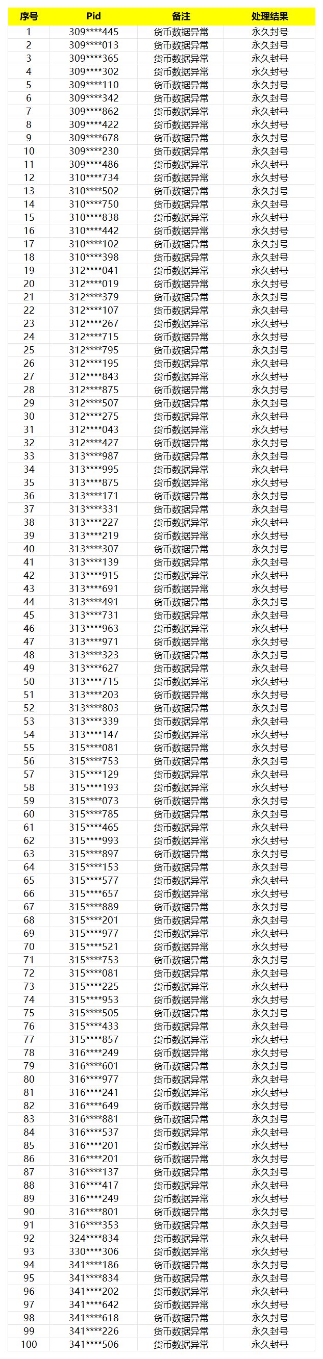 尊敬的各位市长: 为了维护游戏的公平和秩序,同时保障各位市长的利益和账号信息安全,对于《模拟城市:我是市长》全平台玩家以任何形式破坏游戏环境的相关行为,官方将予以严厉打击和处罚。 本次行动针对部分渠道账号进行核实,从严查处游戏内数据异常行为,市政工已收集了相关违规账号信息,并对这些玩家进行了账号冻结处理,将于此公告中予以公示。 与此同时,我们也在持续升级防作弊功能,我们会尽最大努力为各位市长