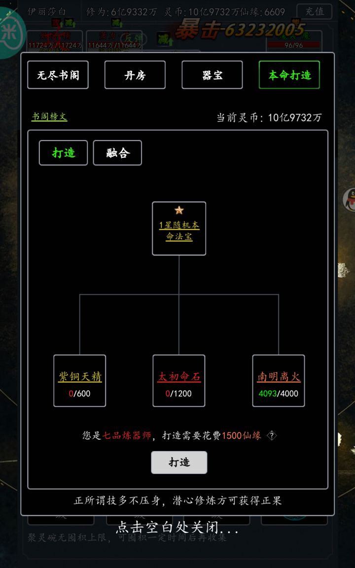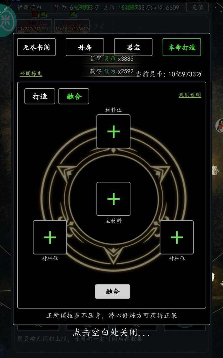 区服:747区 无(刚刚从极少的资料里汲取概括的,制作不易,还有写的不好的纠正呀)今天7月29日更新了一项新的内容:那就是本命法宝,首先本命法宝会在开服45天后出现,具体在无尽书阁里,分为打造和融合。打造,顾名思义,就是收集材料打造本命法宝,材料中出现了两个新的材料,需要挑战混沌魔墟中的新Boss——魔界主宰,当然,这只是平民玩家的获取渠道,氪金大佬可以通过氪金获取,价格具体为648,主角界面也为这个法宝创建了一个新的法宝栏,打造本命法宝,你的无尽书阁等级越高花的仙缘也就越少。关于融合,需放置一个主材料,其他几个位置所放置的必须与主法宝星级一样哦,然后所以副材料将会消失,而你的主法宝就会提升星级,当然,副法宝消失也不会全部吞你的材料,材料什么的会全部返还哦~(刚出没多久,写的不好请谅解)