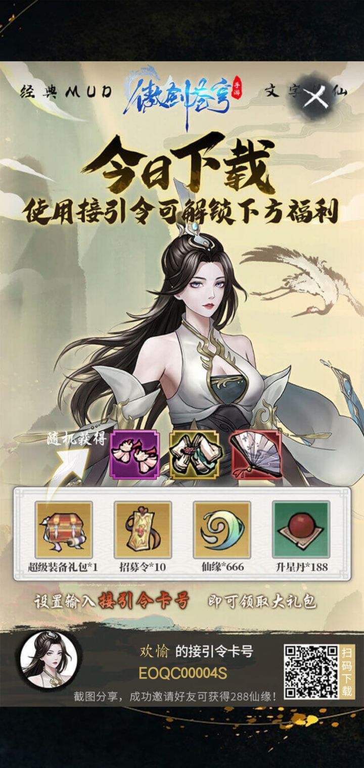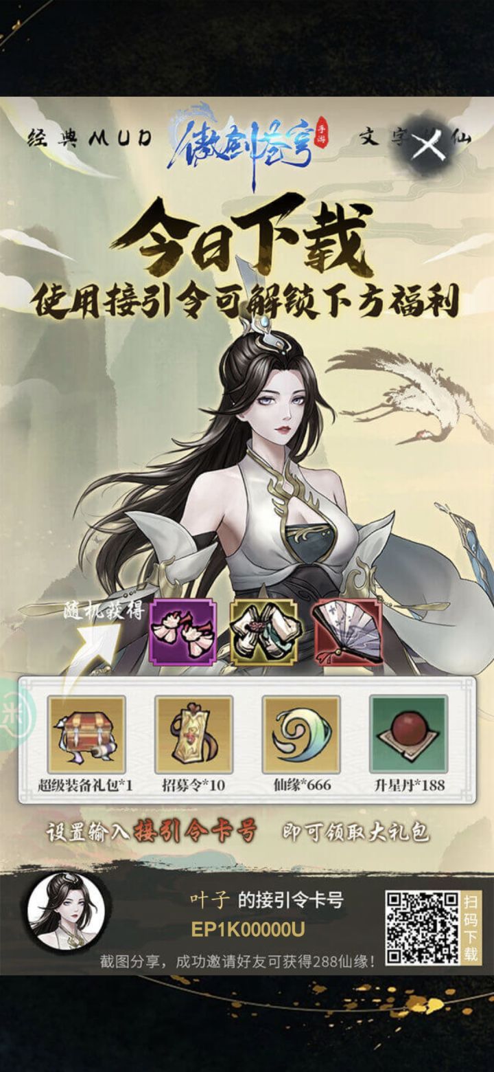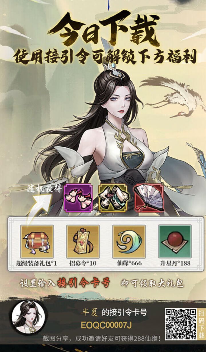 接引密令EP3C00000E设置里最下面输入接引密令领取超级装备礼包1份、十个招募令、666仙缘、188升星但