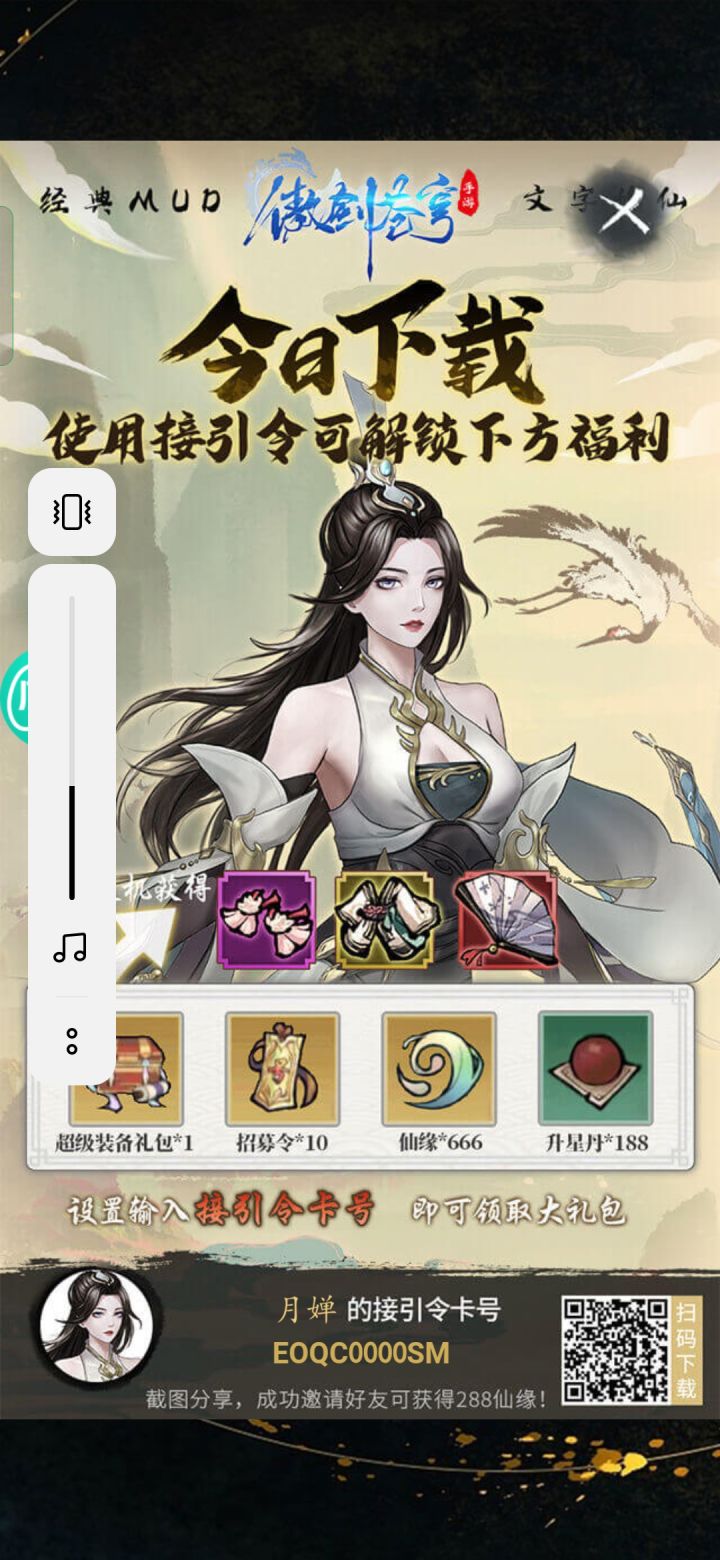 欧气接引码ENMG00002J新人玩家在下载游戏当天游戏右下角的设置里面的最后一格接引密令输入ENMG00002J就可以获取一次免费的十连抽和666仙缘and其它奖励~各位道友一发十连出姬瑶出唐灵冲冲冲!