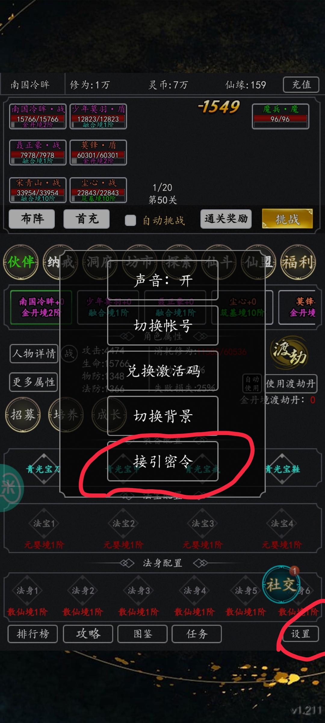 点击右下角设置,输入接引密令ENB400002R领取十连抽啦
