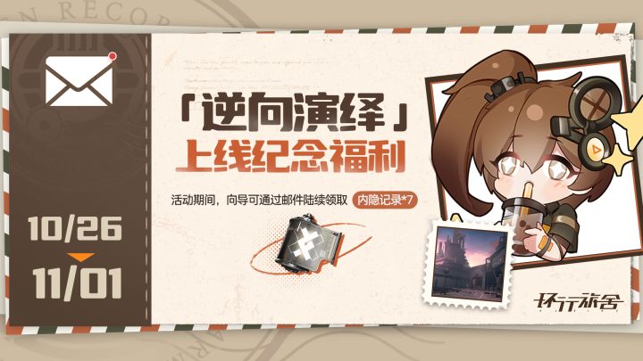 为了纪念《环行旅舍》新玩法「逆向演绎」上线,特勤组将在10月26日更新后,为所有向导献上福利邮件一份,请各位记得及时领取哦~▼活动说明▼活动期间,向导每日登录《环行旅舍》可领取「逆向演绎」上线纪念福利邮件一封,共7封。邮件奖励:内隐记录*1▼活动时间▼邮件发放时间:10月26日更新后~11月1日,每日4:00邮件有效期:10月26日更新后~11月9日 3:59#环行旅舍#环行旅舍新版本