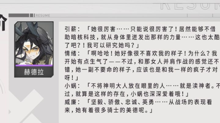 (最后一期,没活咯)有这样一位舍友,是红龙脉人,还未曾在主线中出现。TA有过一段悲惨的过去,在入舍前过过不少苦日子,目前文化水平有待提高。TA曾眼睁睁地看着重视之人在自己面前死去,随即遇见一位名字有三个字似乎逼格很高的人物,获得使用因序力的能力,再一段时间后加入了克莱因舍。TA的立绘主色调为红色,且有一定的“照骗”效果。所以TA是谁