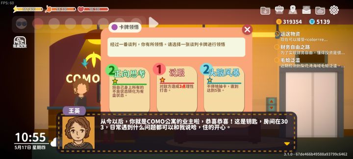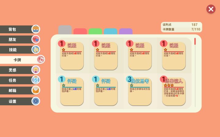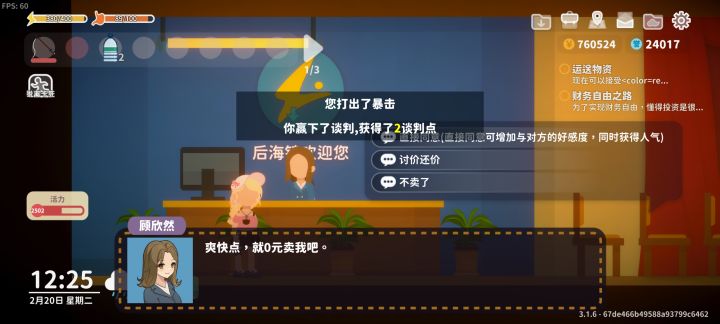 写在前面:本文写于2.2.0版本,请注意时效一、基本介绍(不是纯新手直接跳过看第二点吧)游戏内存在卡牌战斗系统卡牌战斗只在推销和找人购买时,即发生钱货交易时会出现(也就是去杂货店、售卖机、餐馆柜台、书店啥的没法砍价)卡牌战斗会花费现实时间,即你每在战斗内多待一秒,小镇上的时间就会流动一分钟(左下角现实每秒走游戏一分钟)在找人购买时,若谈判成功,会有八折优惠推销时,会花费10精力/1