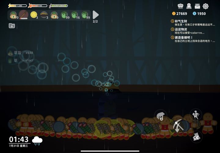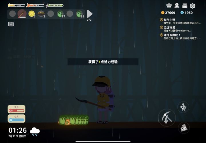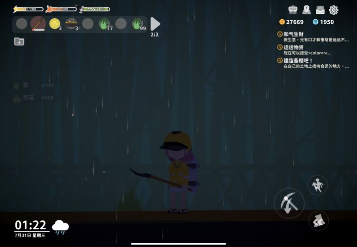 用铁锹先铲20个草种,草种可以叠加种在一起,最后再用铁锹一次性铲完,铲一次才掉2点精力,技能条基本上可以加一等级,同时也会掉大量姜饼人等材料,就是捡草和丢草有点麻烦,