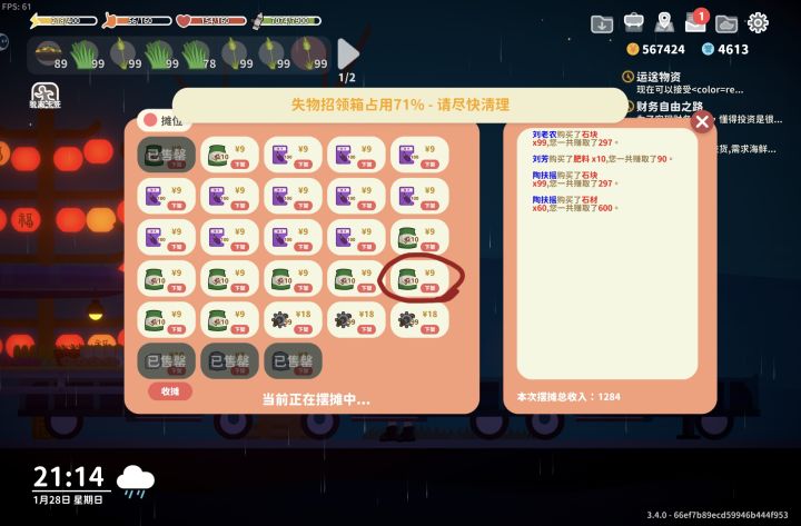 喂食:超级黄焖鸡米饭作为饲料,99个能吃好多天(图1)粪便处理:利用搅拌机制作成普通肥料(图2)通过消化流程盈利:将做好的普通肥料放在三轮车里卖出去,9元一个卖的快,相当于99个粪便能卖891元,这样就赚回了前面买黄焖鸡米饭50%多 的钱(图3)One.扫屎太累怎么办?答:在卖家具的地方买个扫地机(图5)two.不需要要制作饲料和扫把了草怎么处理?答:送出去涨好感度(图4)three