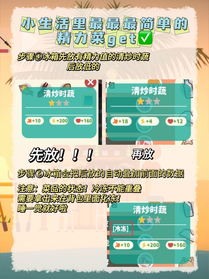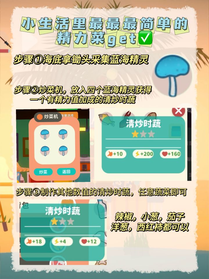 其实精力菜有好几种配方,黄焖鸡或者是白粥都是可以的,但是研究下来发现做清炒时蔬的步骤是最少的,虽然可能你一次需要吃两个但是他需要你动手的次数是最少的,而且只需要四个蓝海精灵即可,后续的蔬菜也可以通过自己种植获得。OK,那这就是一个无限的精力菜了#小生活悠闲小镇物语