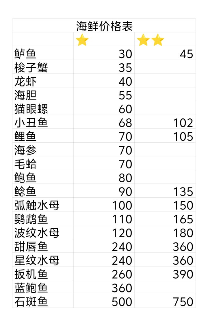 整理了一下目前出的海鲜的价格,都是李海强店里的价格,而且今天刚发现动物也是可以拿去李海强那里卖(5400的牛推销不出去发现他这里居然可以卖