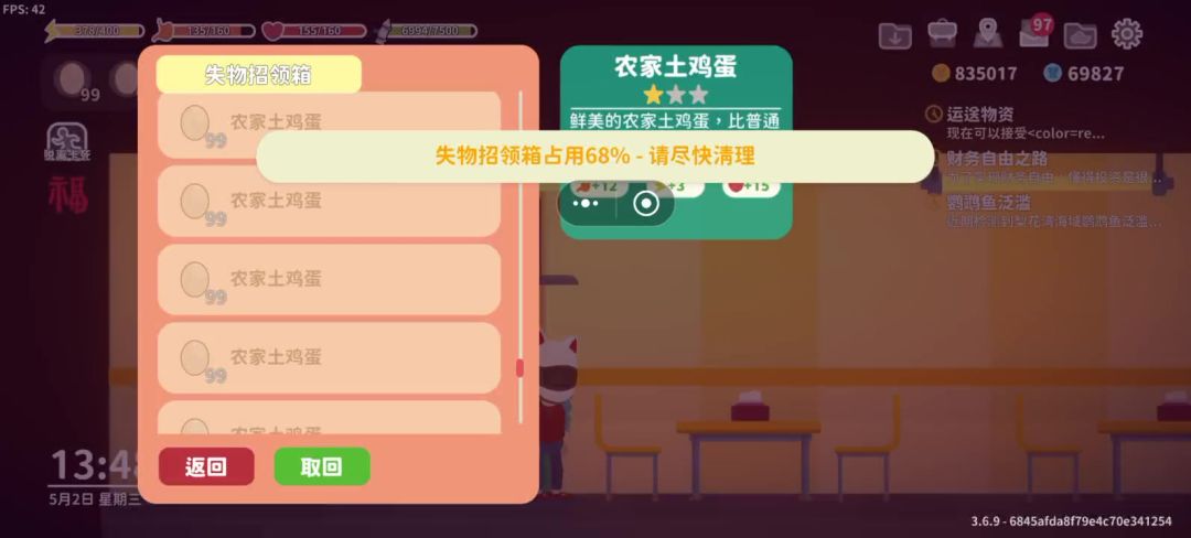好不容易等到鸡蛋二十一个,卖了好久,还有能不能失物招领箱这个出现在左边或者缩小太大了,挡到画面了也不好标价,