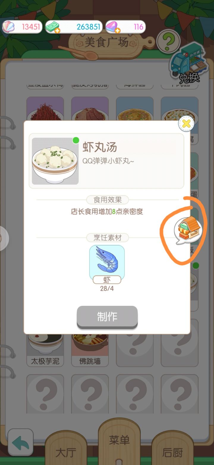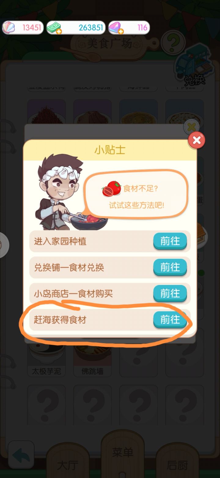 建立美食广场建筑以后,打开菜谱页面,再点开一道菜的具体页面,找SHOP标志,点开,里面有赶海选项
