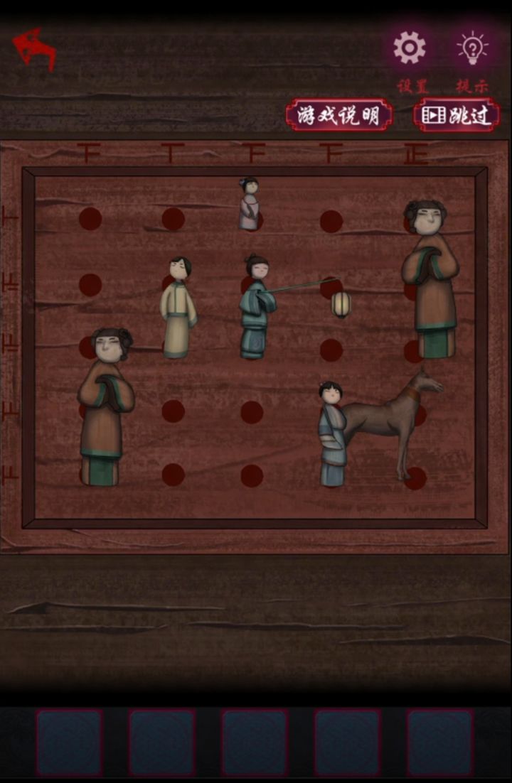 🍀第五章攻略🍀116.拾取篮子里的【剪刀】。116.1117.调整木牌,使图案和节日对应,得到【挽联】。117.1118.将【挽联】给左边的纸人,根据2个纸人手指的位置,得到线索【凄】、【水】、【年】、【恨】。118.1119.根据纸人的线索,调整机关,得到【孔明锁】。119.1120.拾取柜子底下的【铁锹】。120.1121.完成桌上的盒子机关,得到【半块龙纹玉佩】。121.112