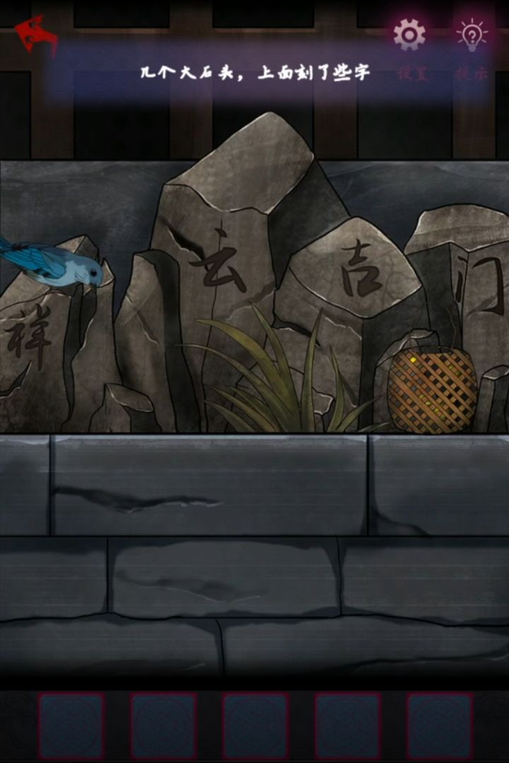 剧情后先找老人对话帮忙捉虫子,对话后自动拿到竹笼,点左下角草丛就能开始捉虫子了,点击下面草丛虫子飞出来,随机飞到上面5个草丛中,需要点到藏了最多虫子的草丛才能捉到一只,捉5只完成,如果实在看不清就选择任意一个草丛一直点~捉完了虫子交给小鸟小鸟就会在四块石头上点头,数一下第一个祥点2次,云点3次,吉点2次,门点1次,所以这肯定不是顺序谜题了,如果没记住可以点竹笼让小鸟再来一遍,记下来后点左侧房门就