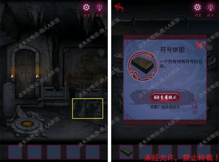 🍀第三章攻略🍀69.拾取石堆里的【符号拼图】。69.170.点击墙上的蜘蛛,根据蜘蛛的移动顺序点击圆盘,得到【嗔字石块】。70.171.将【嗔字石块】放入门的机关,根据石堆的线索(字的位置和方向),调整机关,解锁门。71.172.拾取莲花台的【人偶】。72.173.将【符号拼图】放入门的机关,完成小游戏,解锁门。73.174.拾取【香芯】和【圆盘片】。74.175.将【人偶】放入神龛