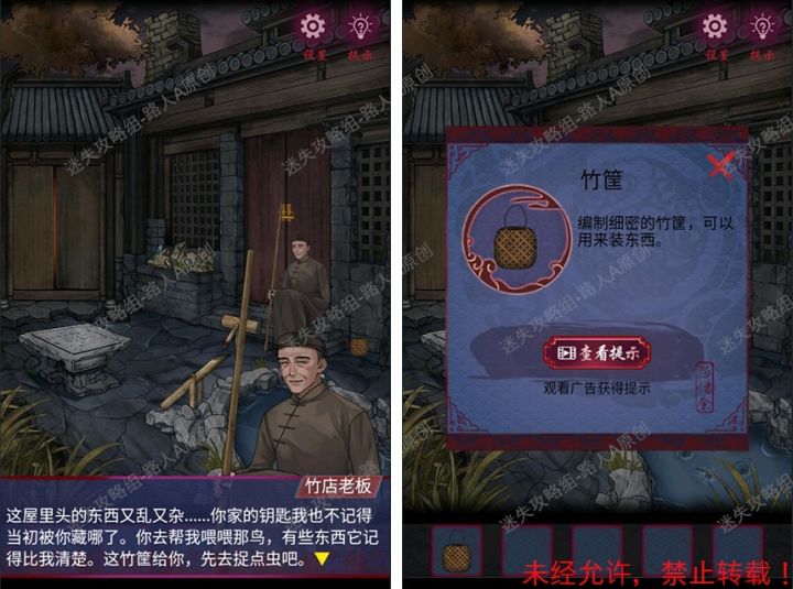 继续第二章攻略~第一个场景暂时是做不了什么的,左边线索可以先记一下也可以一会用到再来,右边拿不到,先往前走来到第二个场景。左边台阶旁边的小水缸拿到2g秤砣,右边门旁边竹编篮子拿到木炭,然后和如意楼老板对话接到任务找两个古籍来换消息,获得鬼脸铜钱一枚,要去供断头佛不就是前面那个么。回到第一个场景不着急去找断头佛,先调查一下左边树上挂着的,发现是有三种长度的,最好是图案画一下因为这个看起来实在是不