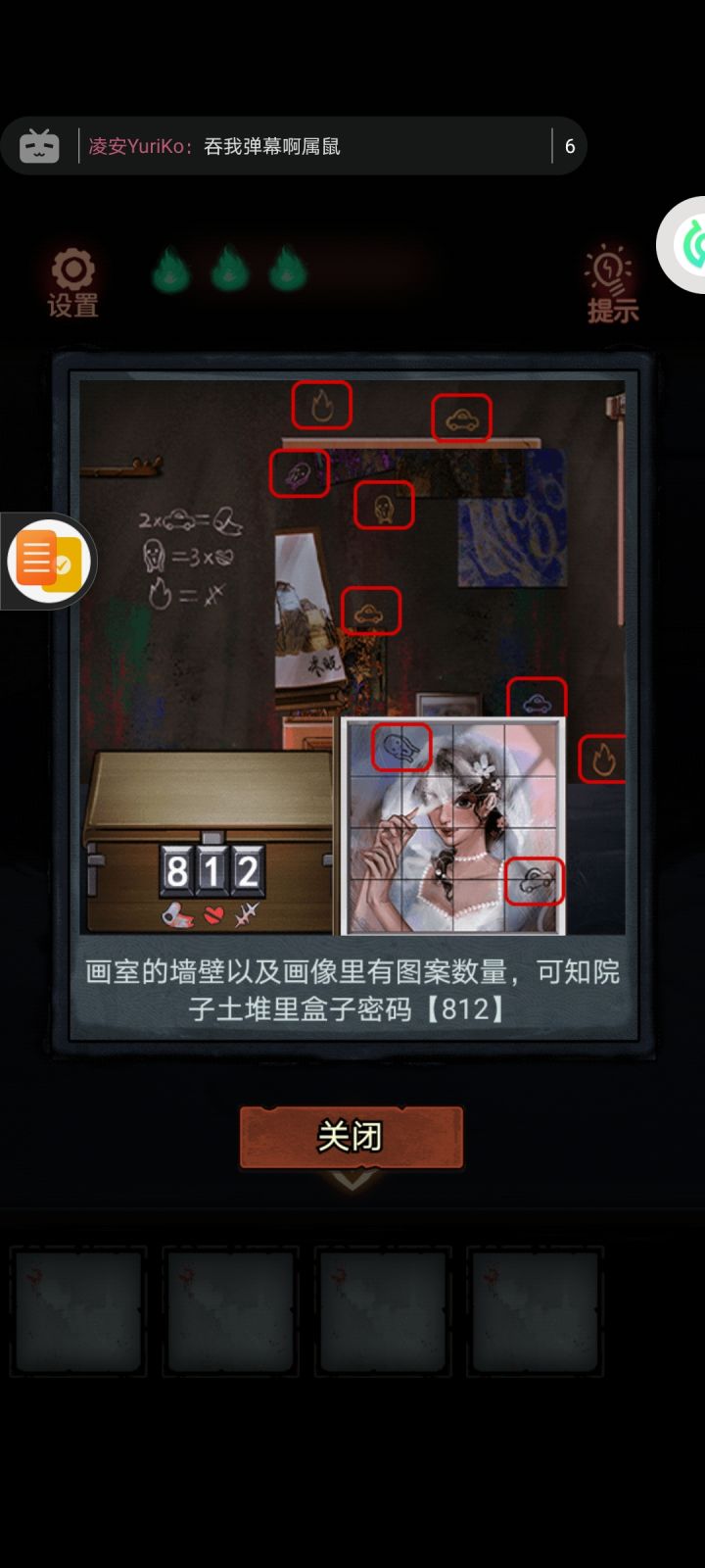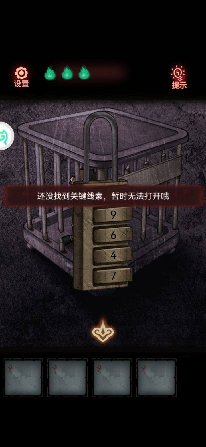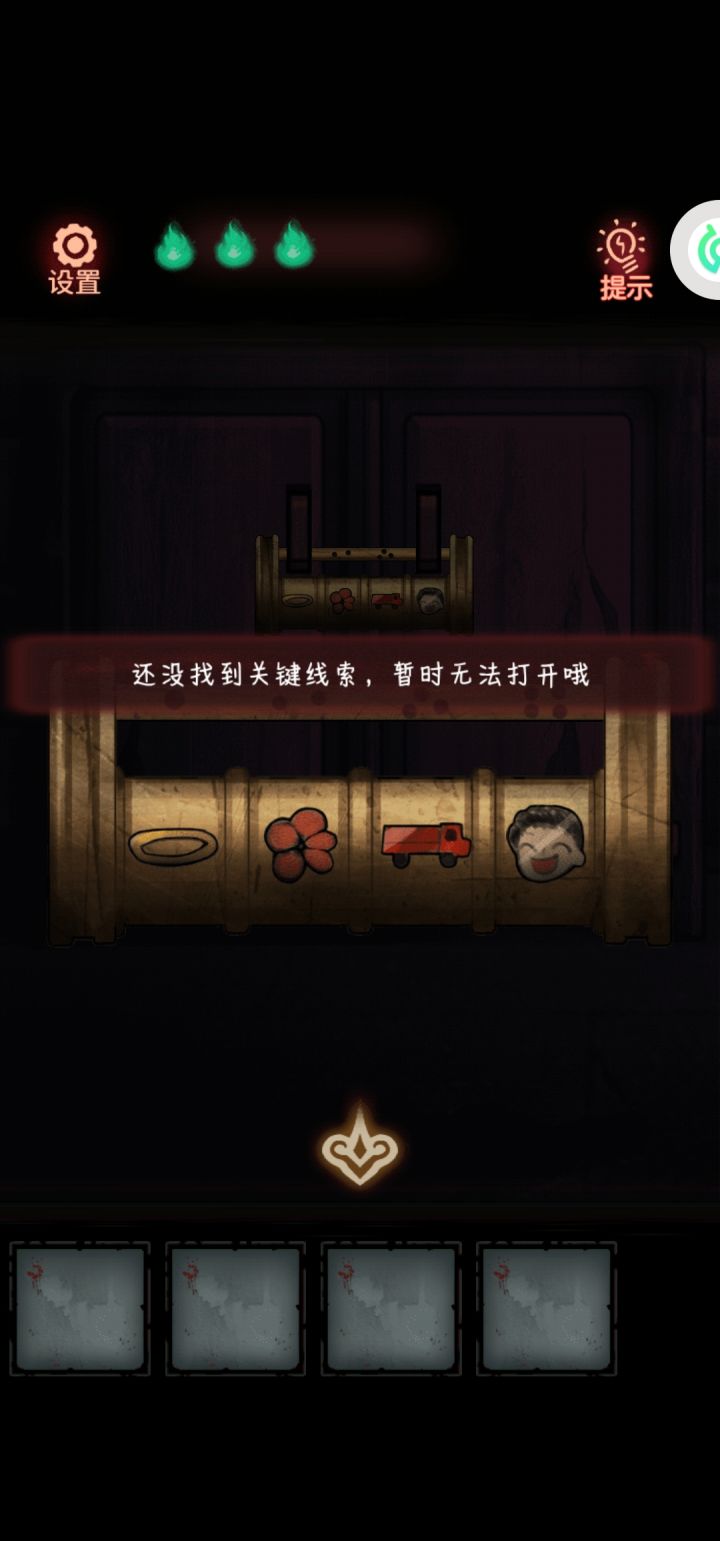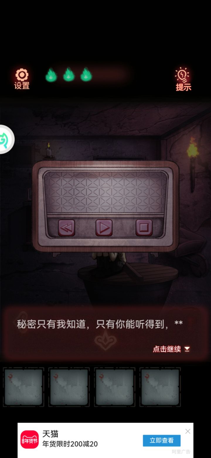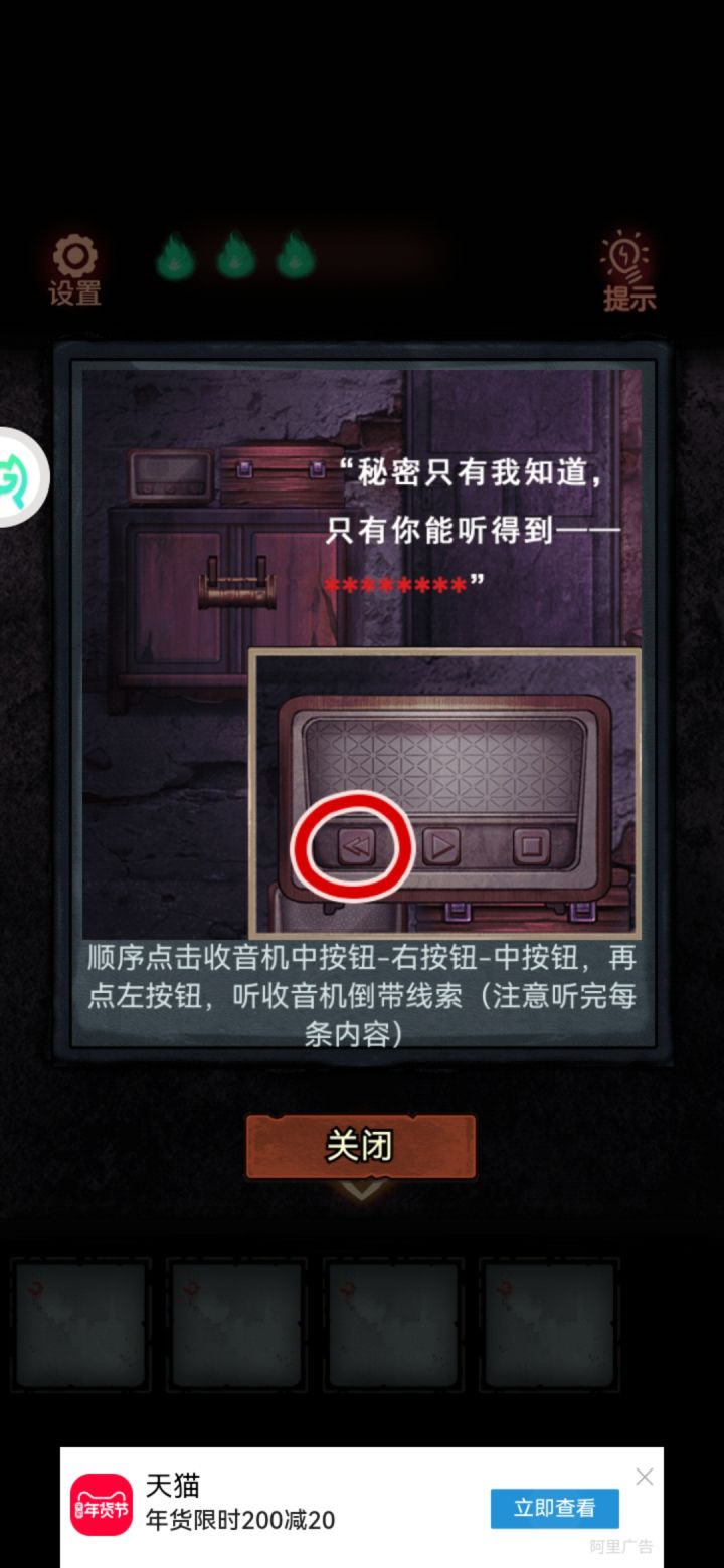 根据图一提示,进行图二,按了没反应,在论坛看其他小伙伴的攻略,输了密码,显示缺少关键线索,我懵了,按了收音机没有声音出来,只有屏幕显示的字幕。