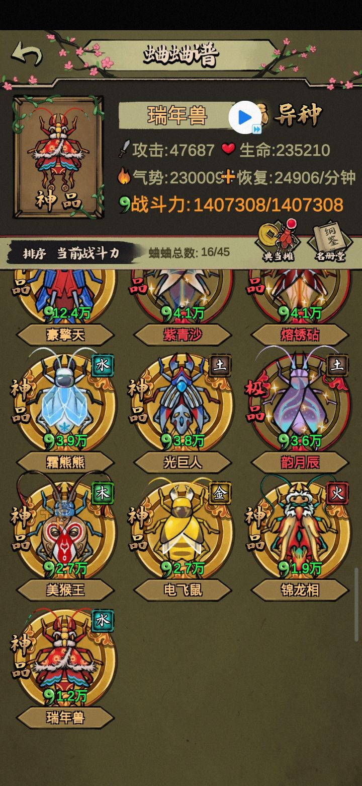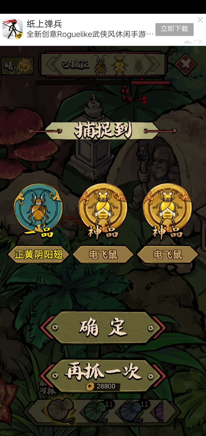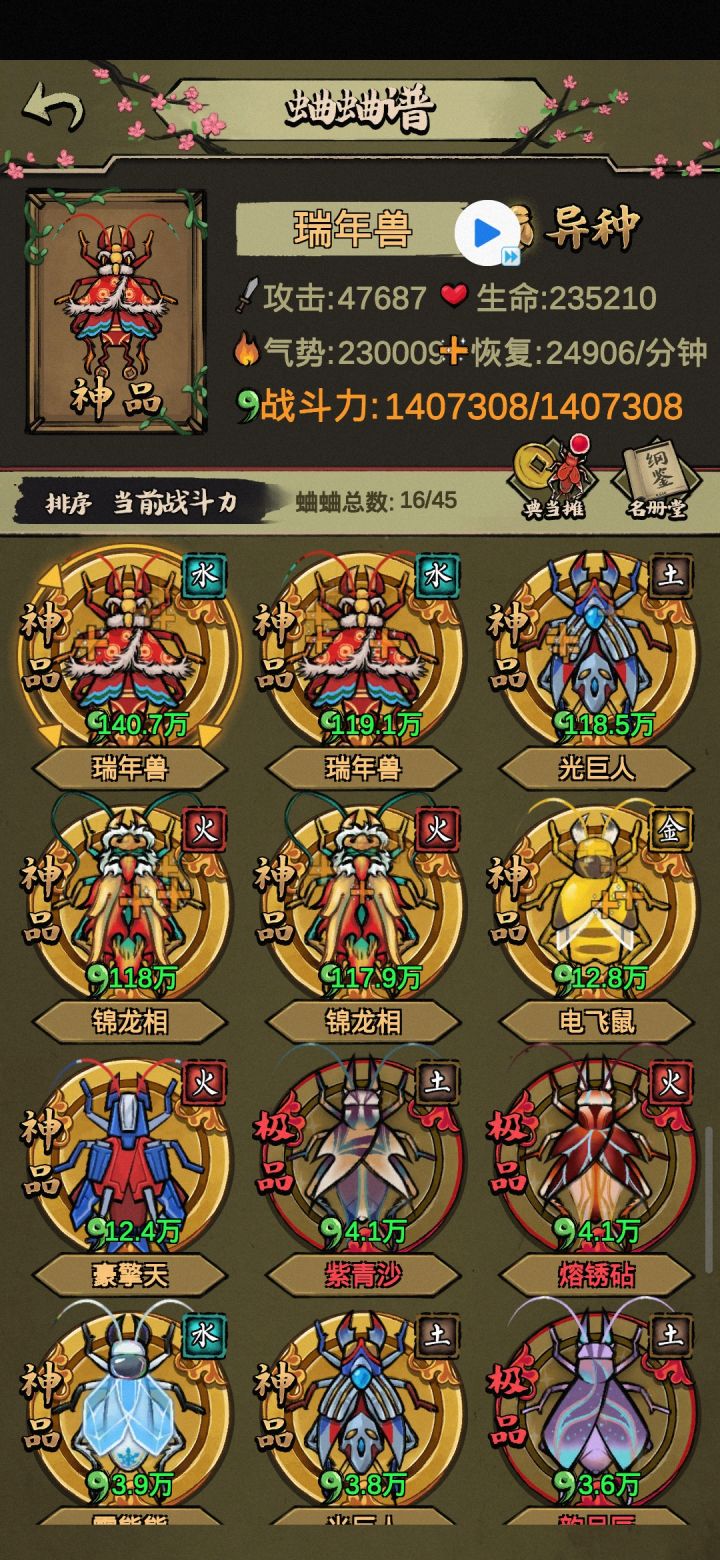 3、享受抓蛐蛐,开图鉴的过程,这里不建议在野外刻意抓神品,浪费很多时间。神品除了白虎和玄武,都可以培育的。培育屋,除了荒野(培育速度减半那个)的词条,其他都是没用的,时间就是金钱,荒野培育出好东西的概率都是一样的,而且时间减半。