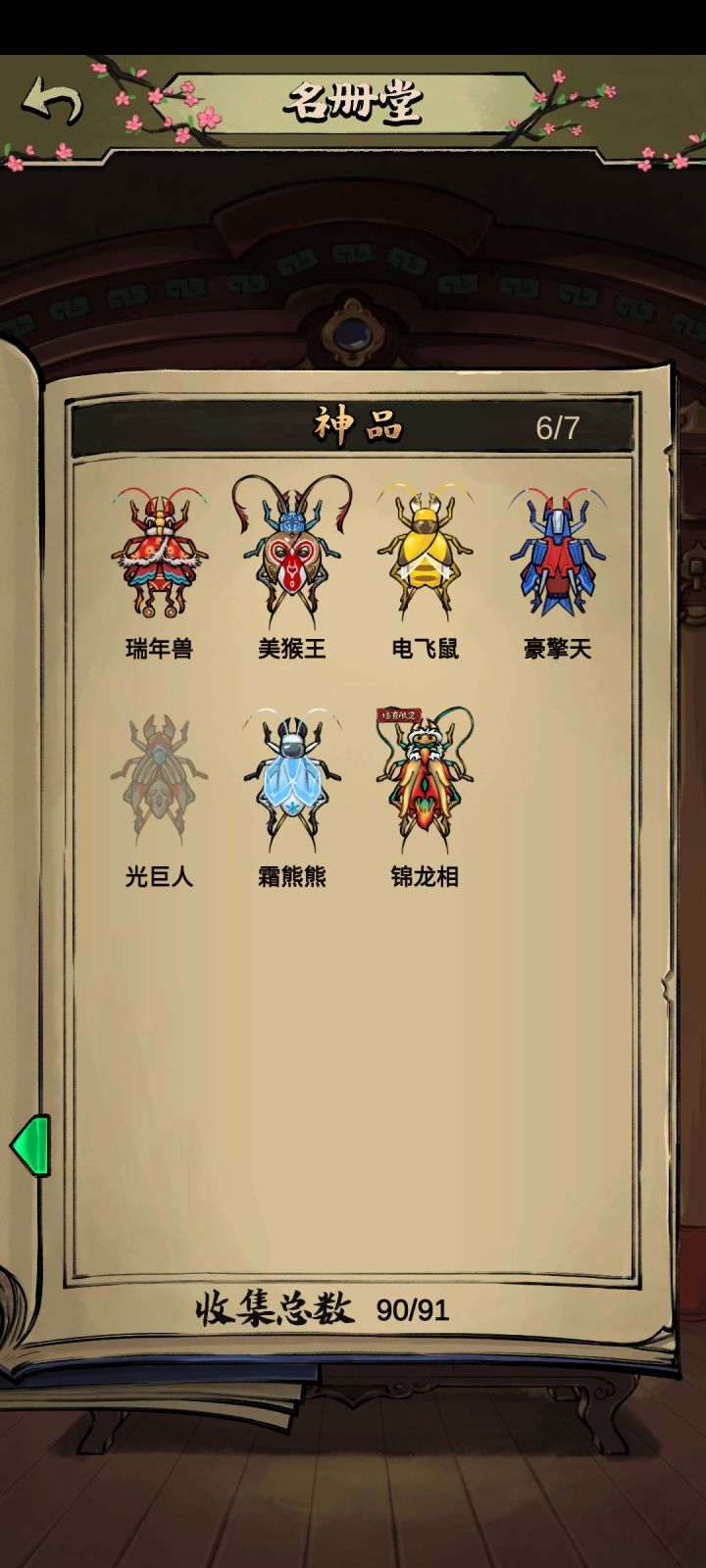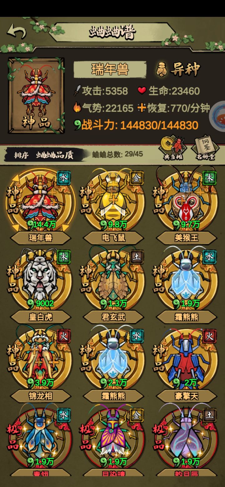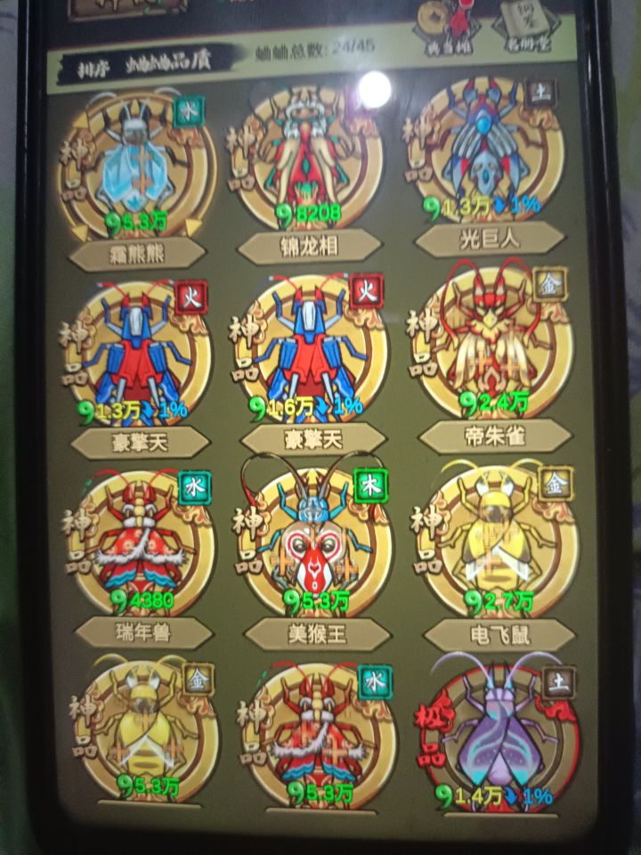 想知道怎么抓神品吗?直接用最低级的笼子抓不是神品就放,开始先点广告把石头全搬,出来一只蟋蟀就抓不是神的就一直放。我用这个方法一次就完成了,抓到了一只猴子。没用这个方法抓了几十次都抓不出来。进一次三次抓不到我们就以数量取胜。第二张是我一个小时之后抓到的。最后那张是我第二天的,反正抓不靠谱的,还是培养靠谱。第五第六张是我第二天11点钟的,过了今天我神品就全凑齐了,现在一共十一只
