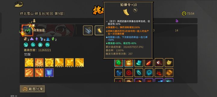 轮回九层,单人如何刷到最高伤害?1.选择可以增加弹道数的武器铭文,我这里选择青铜虎炮,可以看到弹道数加一,最后在双持下基础伤害8000以上。2.初始灵佑可以选择暴击狂热和铁匠传人。之后在打雪山前可以把灵佑换成适合狗的兵贵神速,生命之力和武器全才任意其二就够了,再加上一个其他加伤害的灵佑3.最重要一点是在每关有行脚商和精魄商人的情况下刷秘卷,将带有幸运一击的秘卷和可以组合成一套的秘卷刷出来之后
