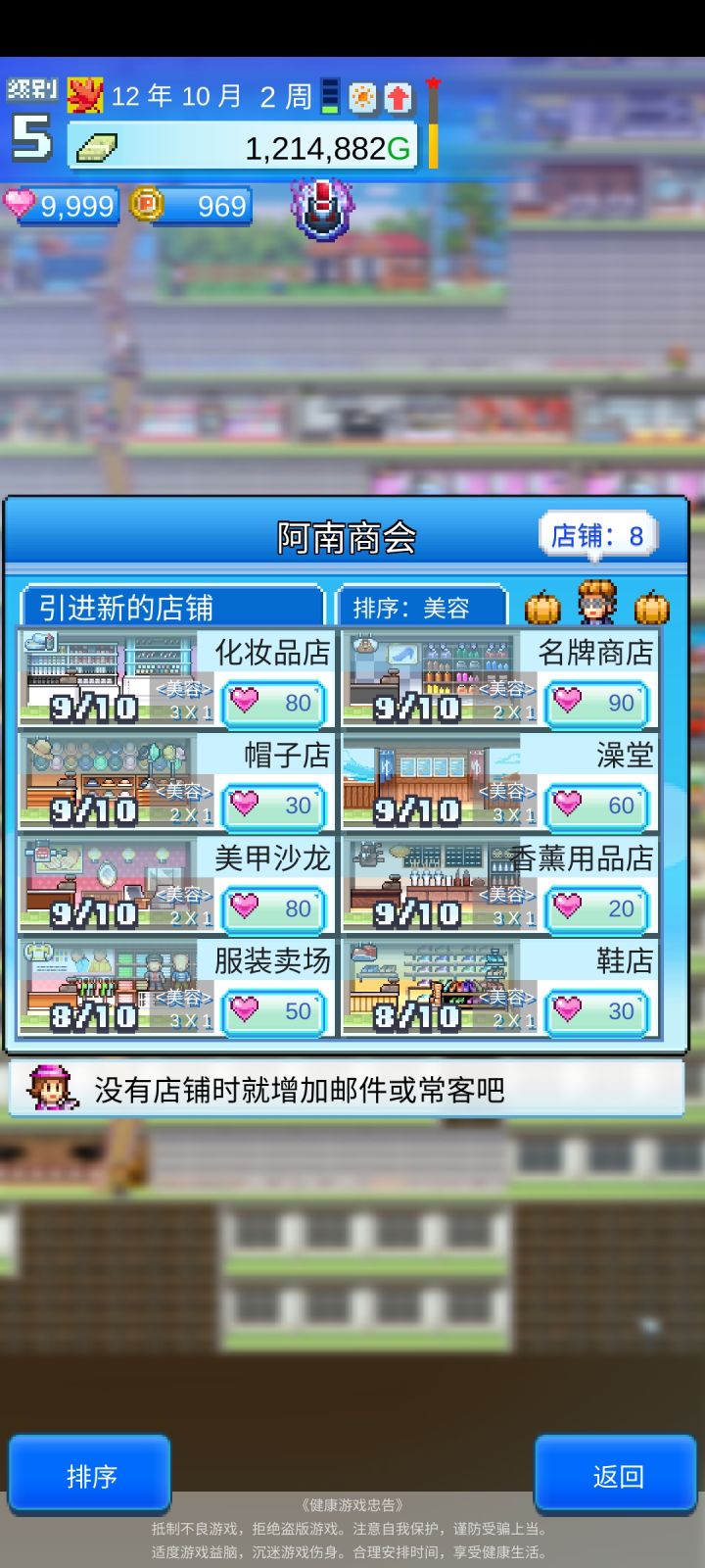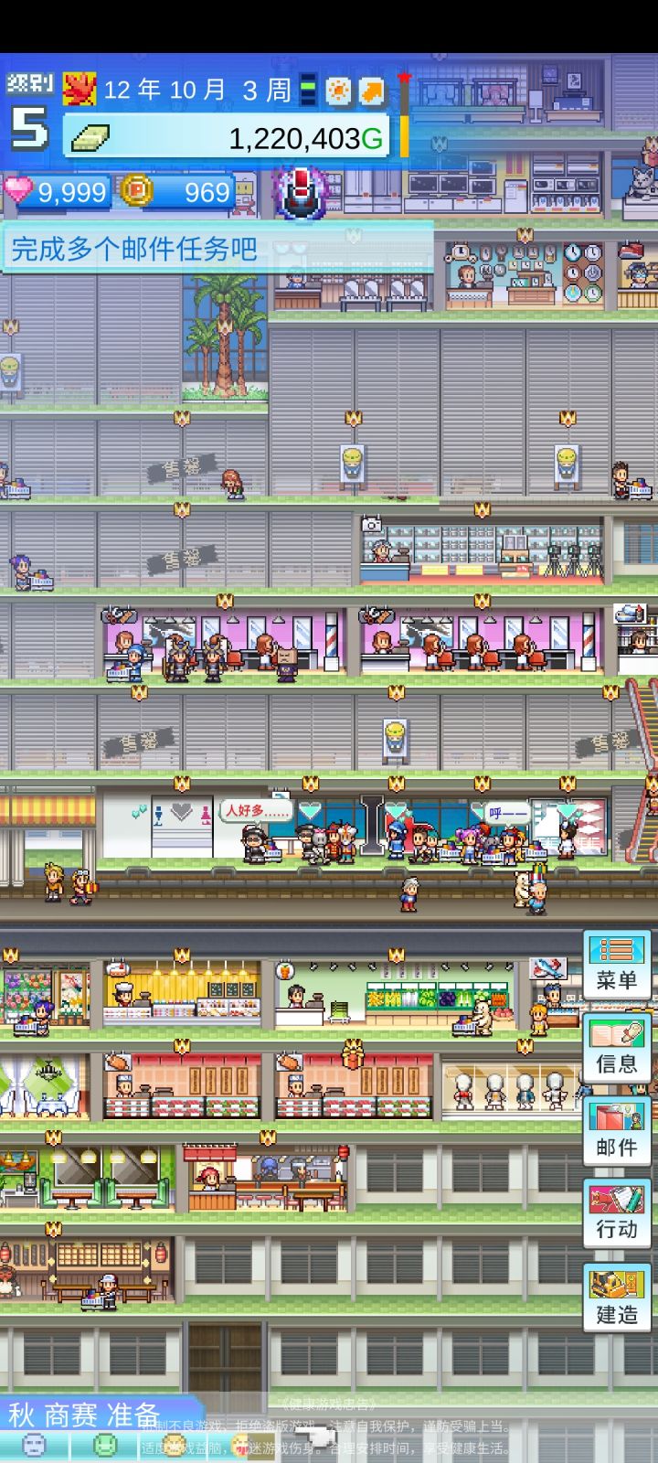 纪念一下,百货商场物语玩通关啦,后期钱和爱心根本用不完,只要把现有店铺一直升级,就会达成邮箱人的要求并给奖励。另外tips: 只要把商品单价高的商店安置到到第一层,钱就可以迅速攒起来。